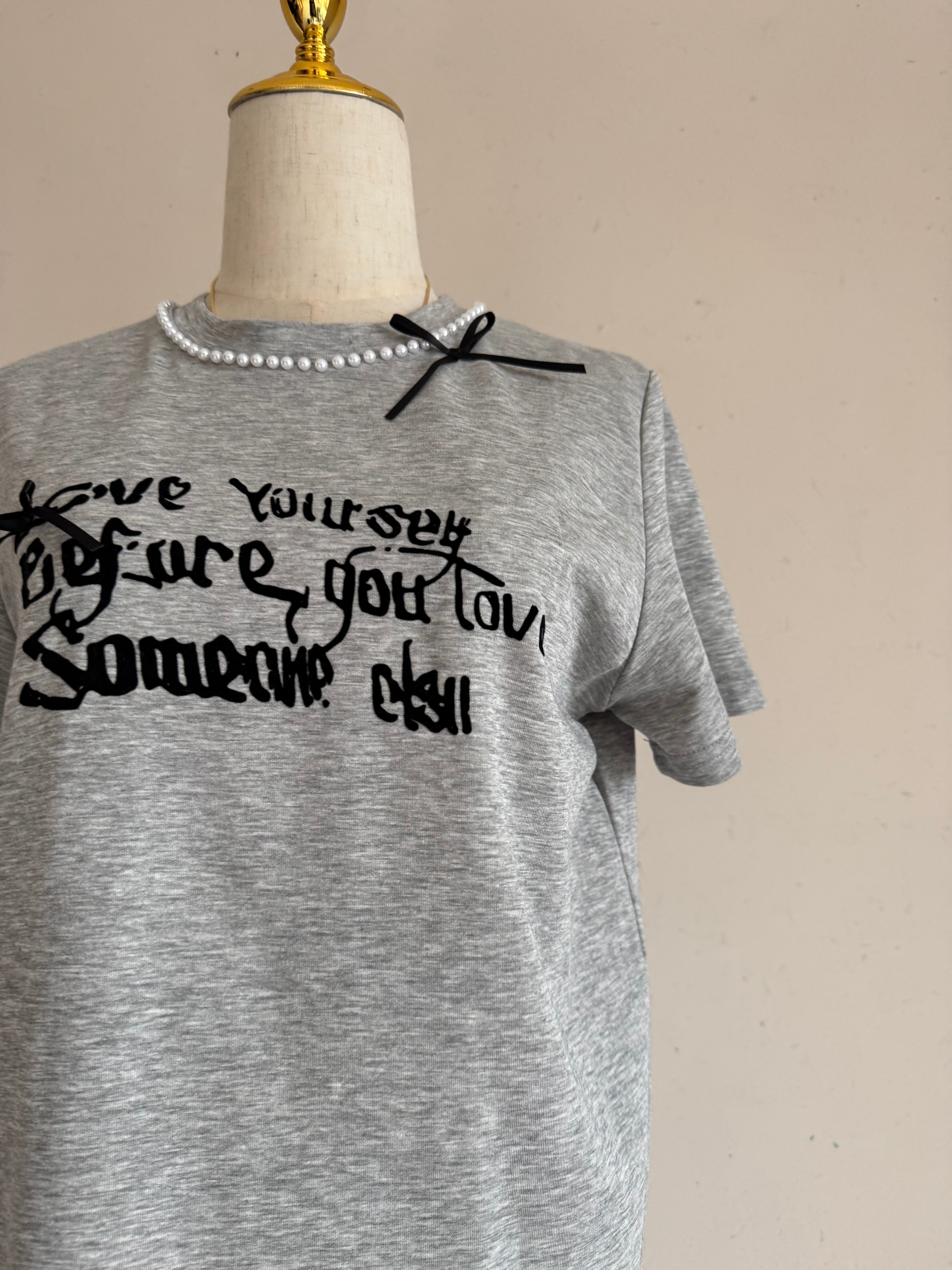 ラブリー リボン & パール 装飾 レタリング Tシャツ (グレー)