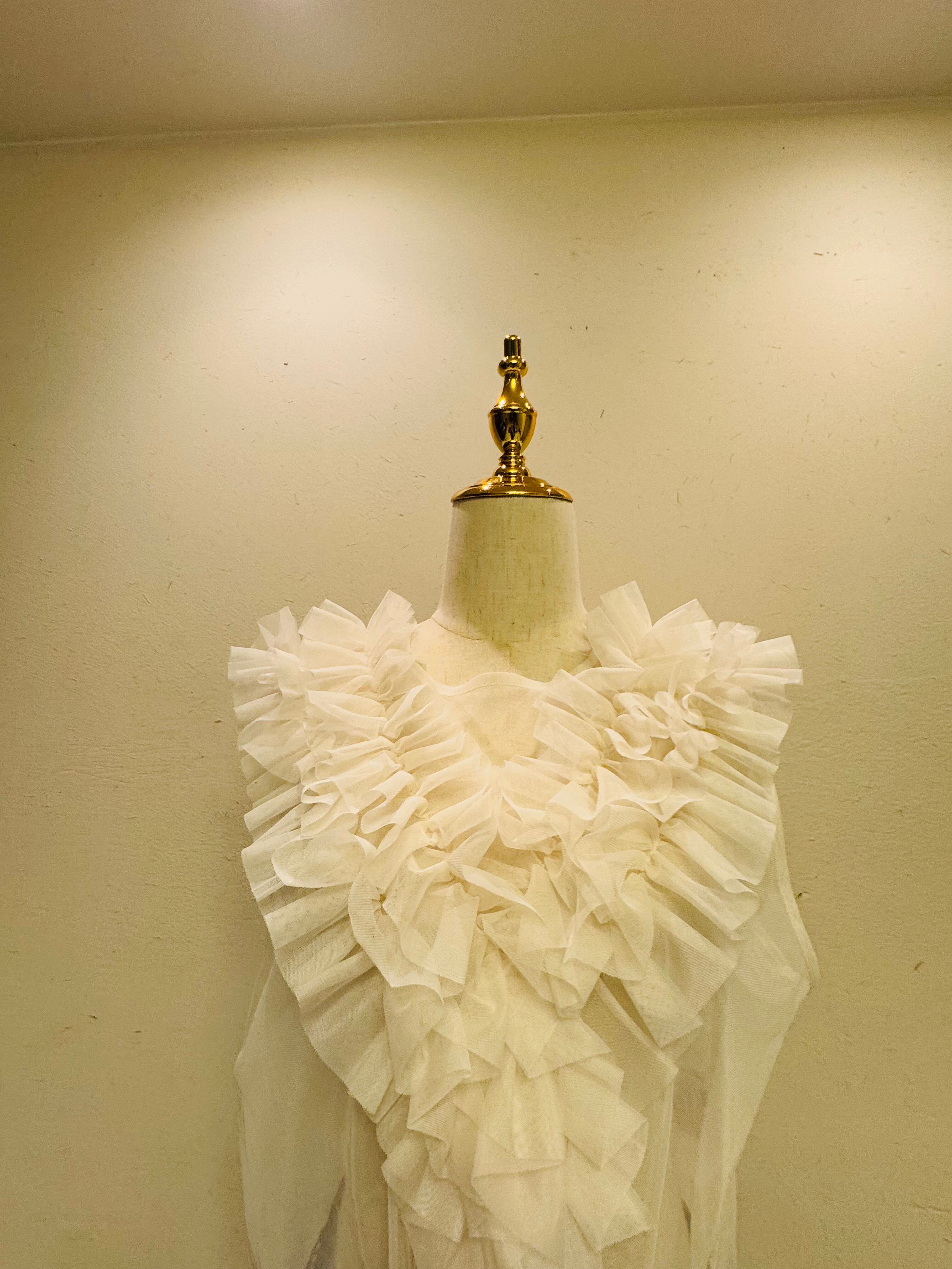 • デザイン: 豊かなフリルディテールが目立つ肩ラインとネックライン
