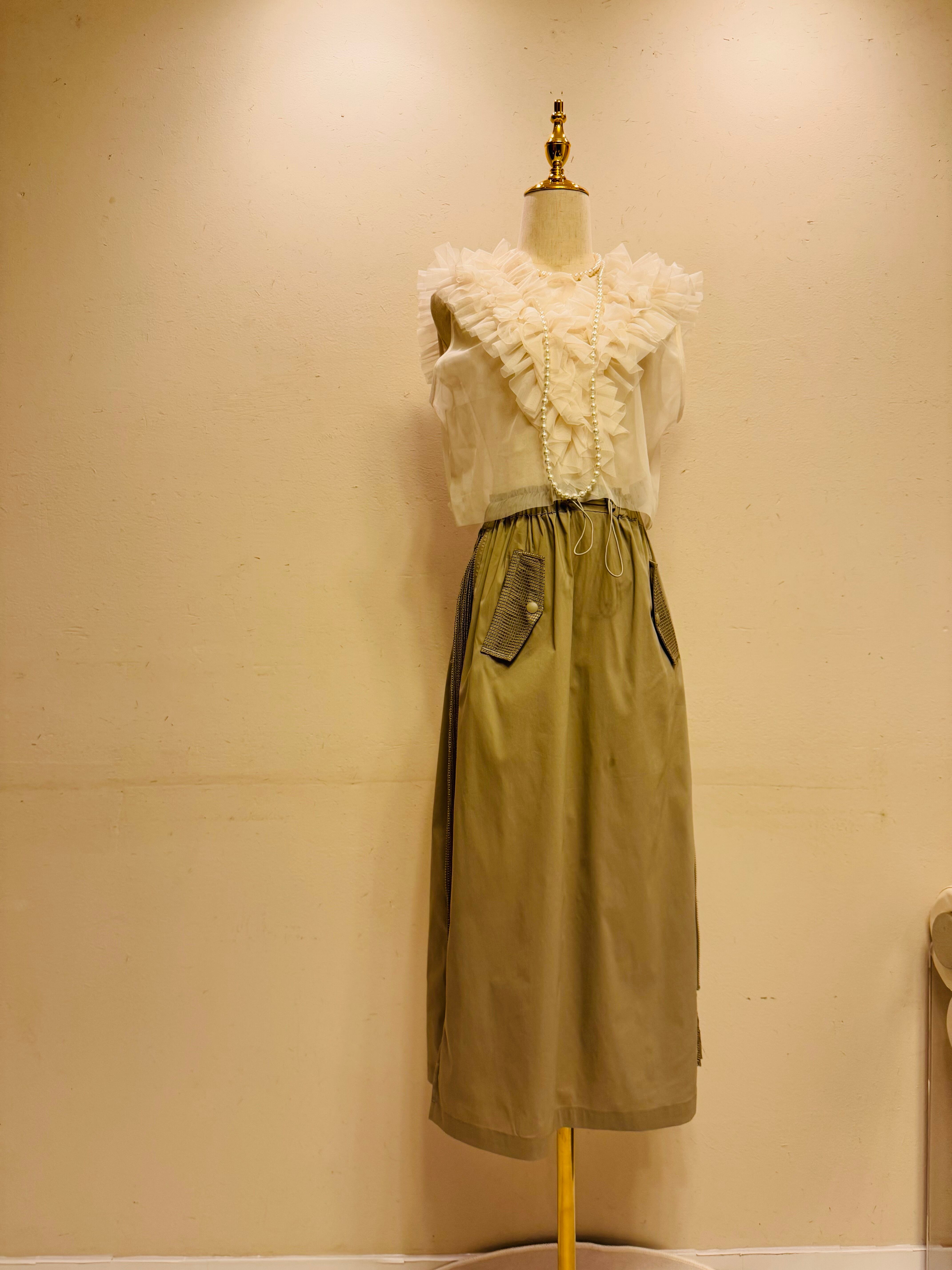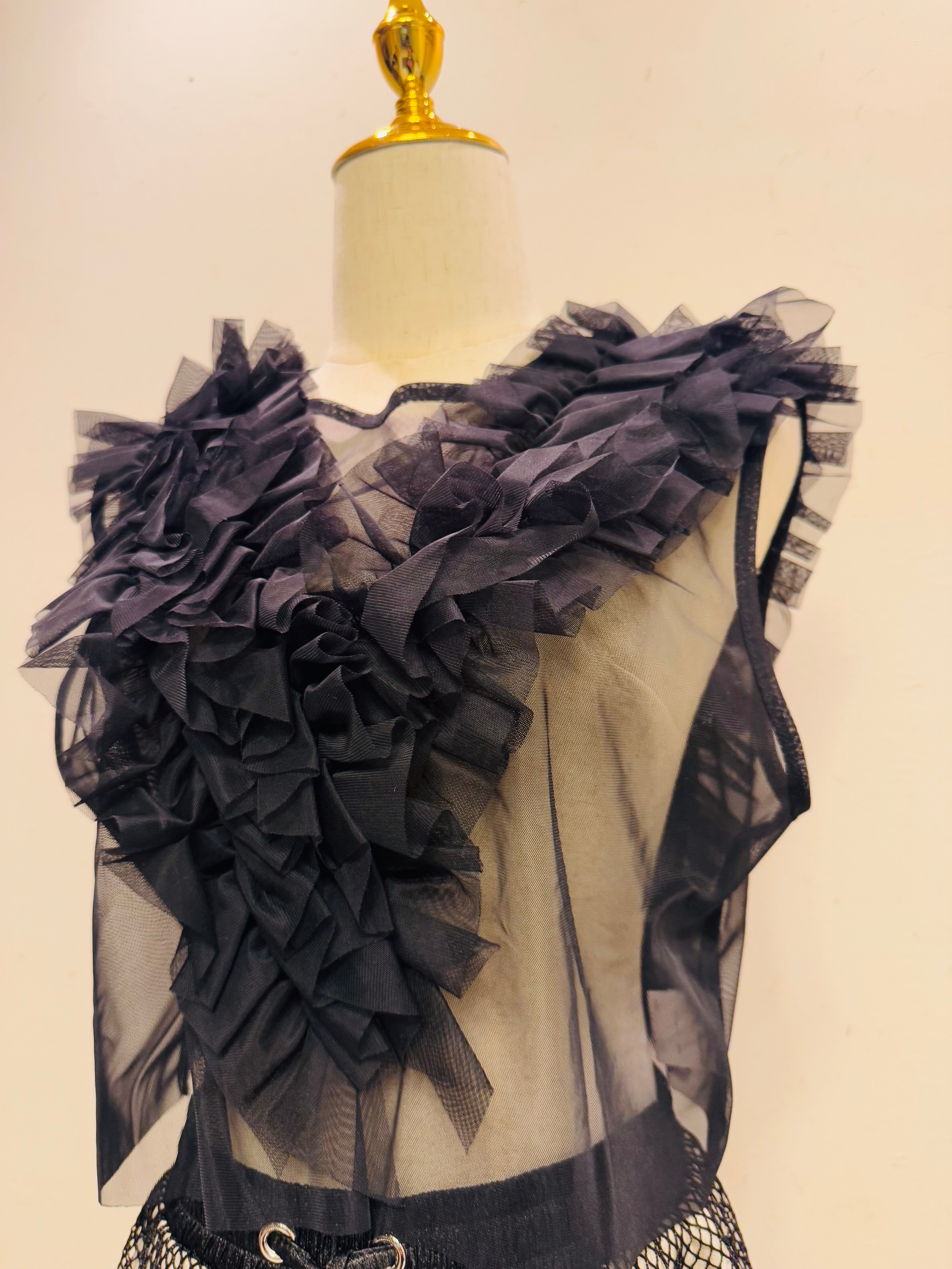 高級なオーガンザ素材で製作されたラッフルブラウスです。 ネックラインと肩の部分に豊かなラッフルディテールが特徴で、エレガントでフェミニンなムードが演出できます。 ほのかなシースルーデザインが洗練された感じを加え、様々なスタイリングが可能なアイテムです。 フォーマルな席からカジュアルなスタイリングまで活用度が高いです。
