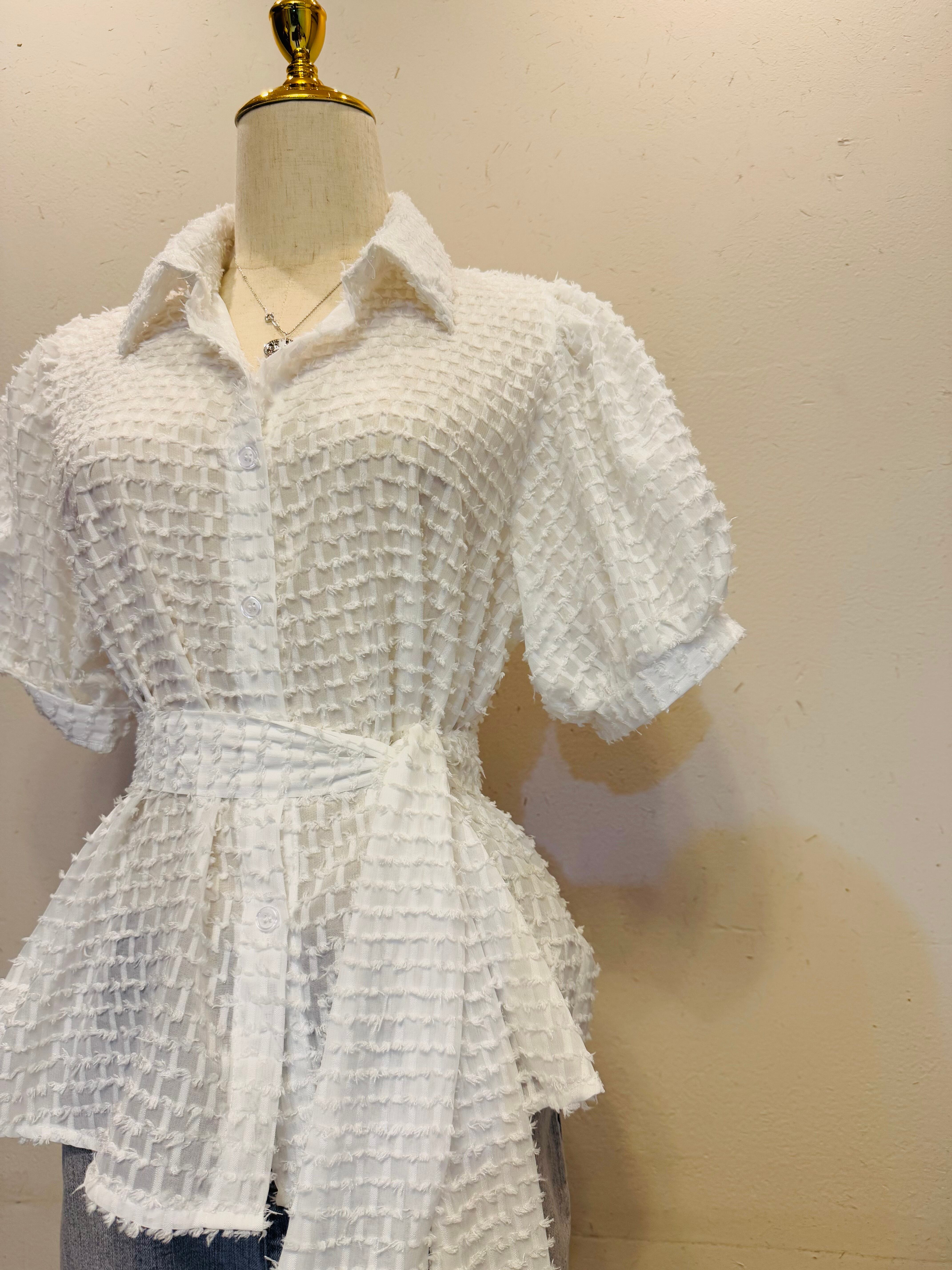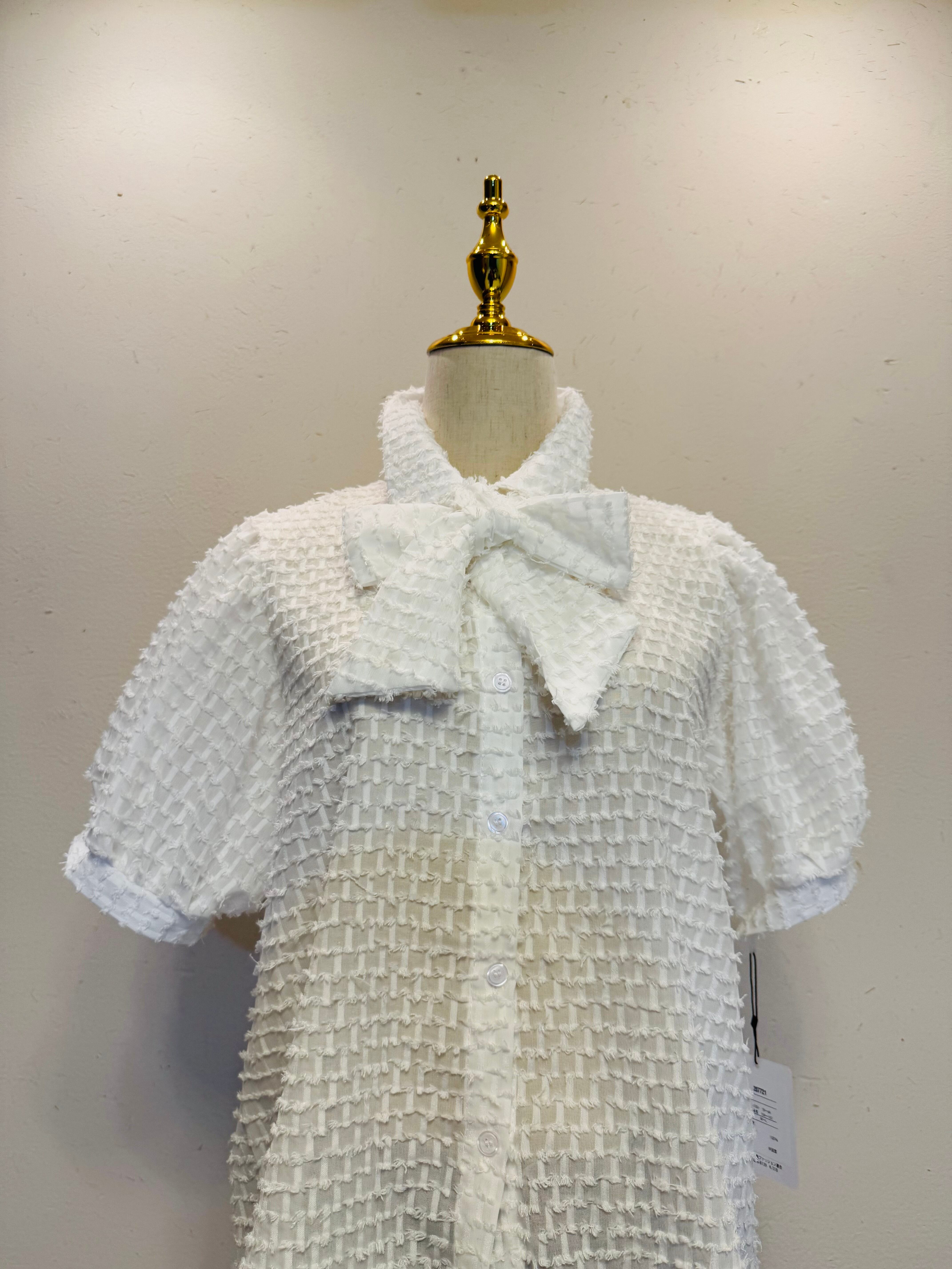 ホワイト テクスチャー リボン ブラウス (White Textured Ribbon Blouse)