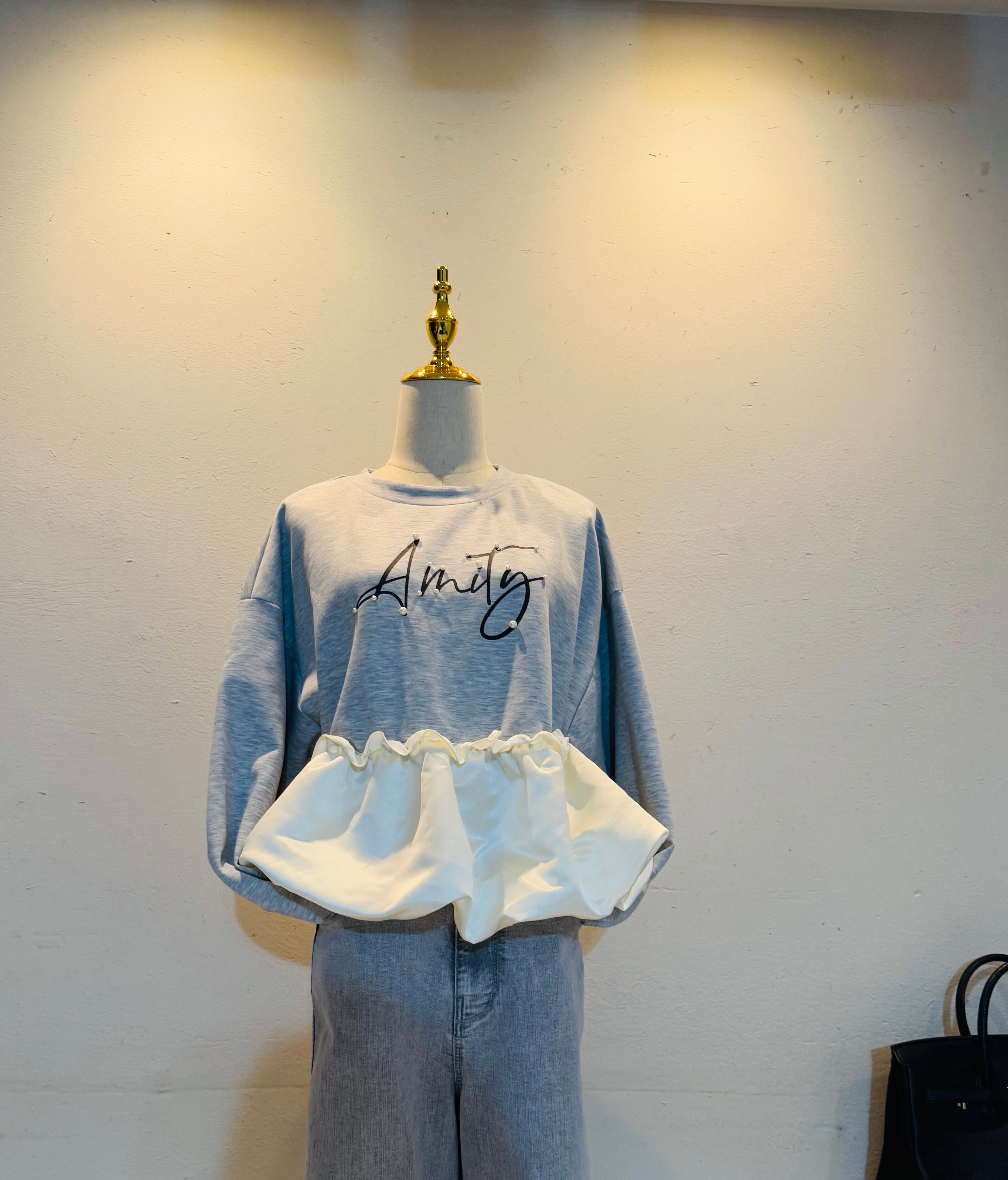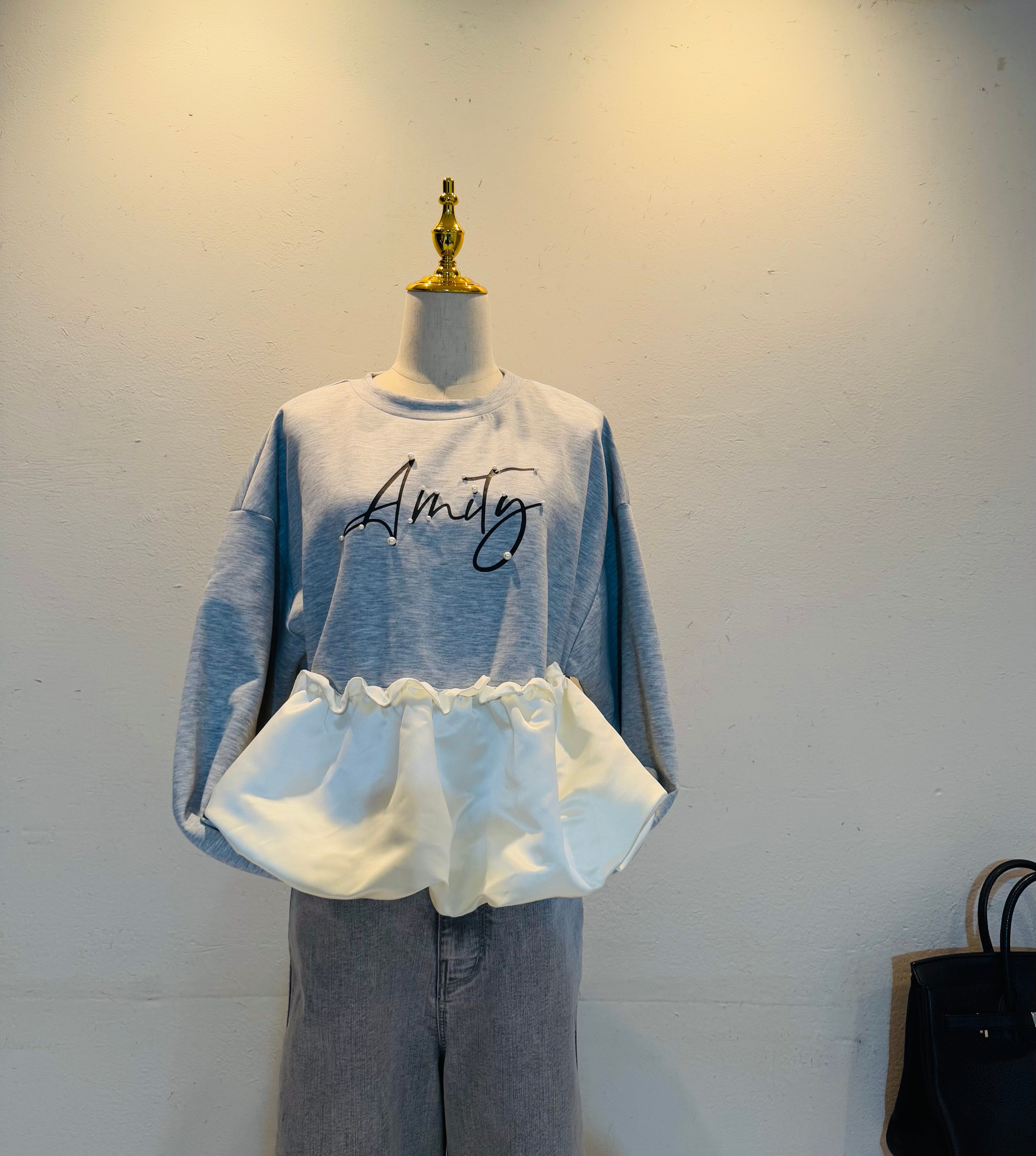 グレーカラーのルーズフィットマンツーマンTシャツで、前面には感覚的な筆記体「Amity」レタリングがデザインされています。 下段にはラブリーなホワイトフリルが加わってユニークなスタイルを演出し、カジュアルながらも女性らしい感じを同時に生かすことができる製品です。 楽な着心地とスタイリッシュなディテールが引き立つアイテムで、デニムパンツやスカートと一緒にマッチするとよりオシャレです