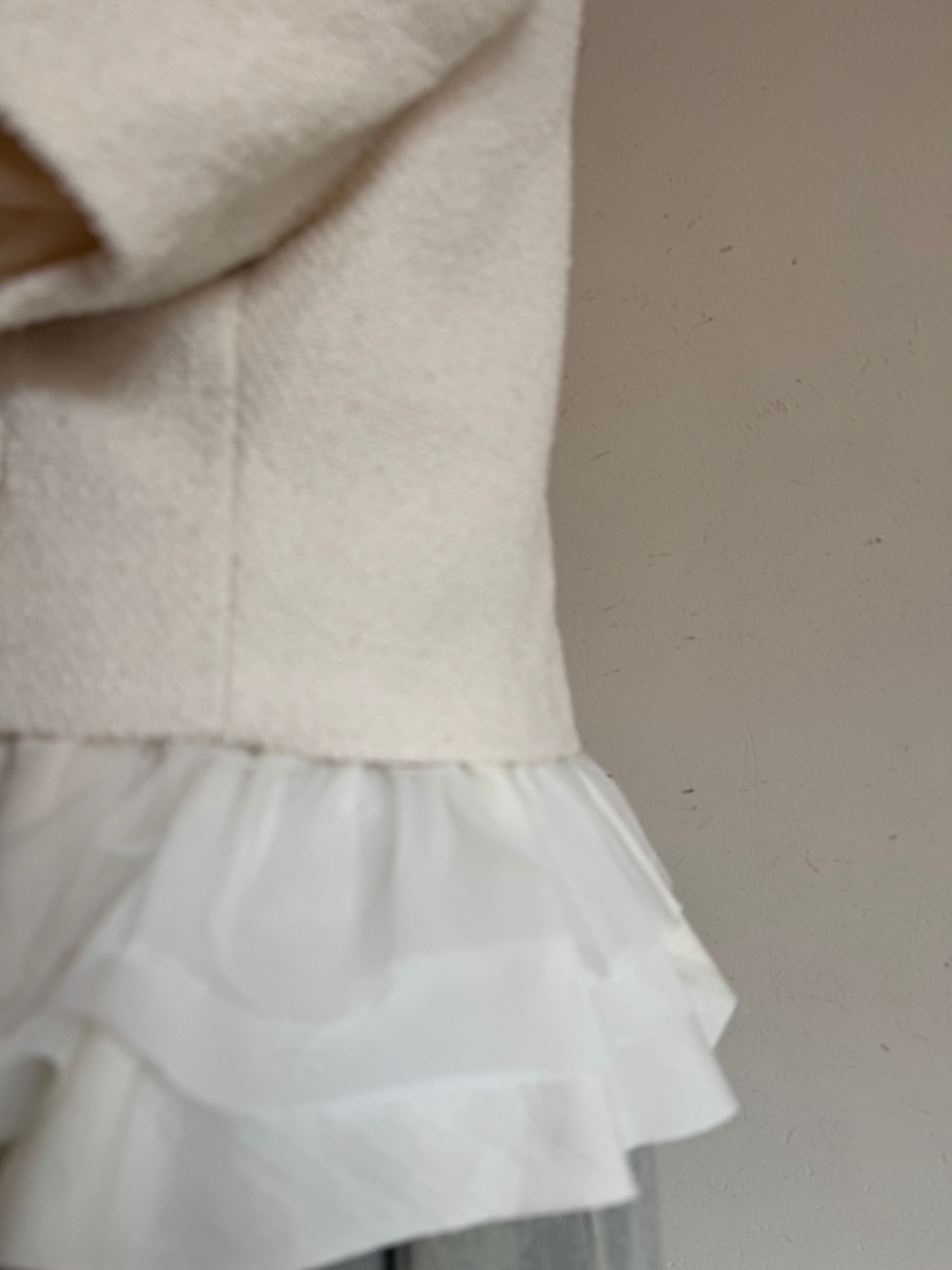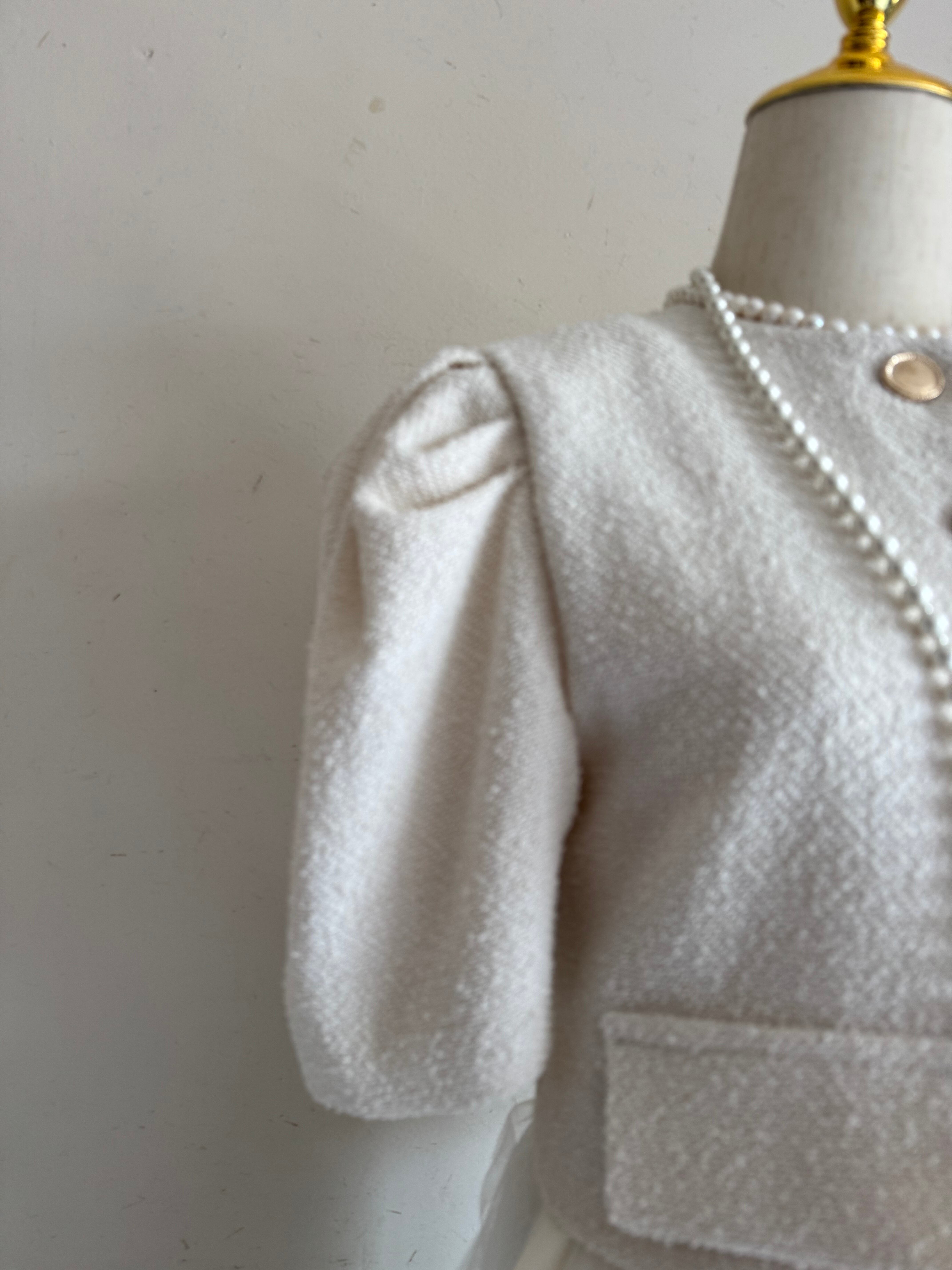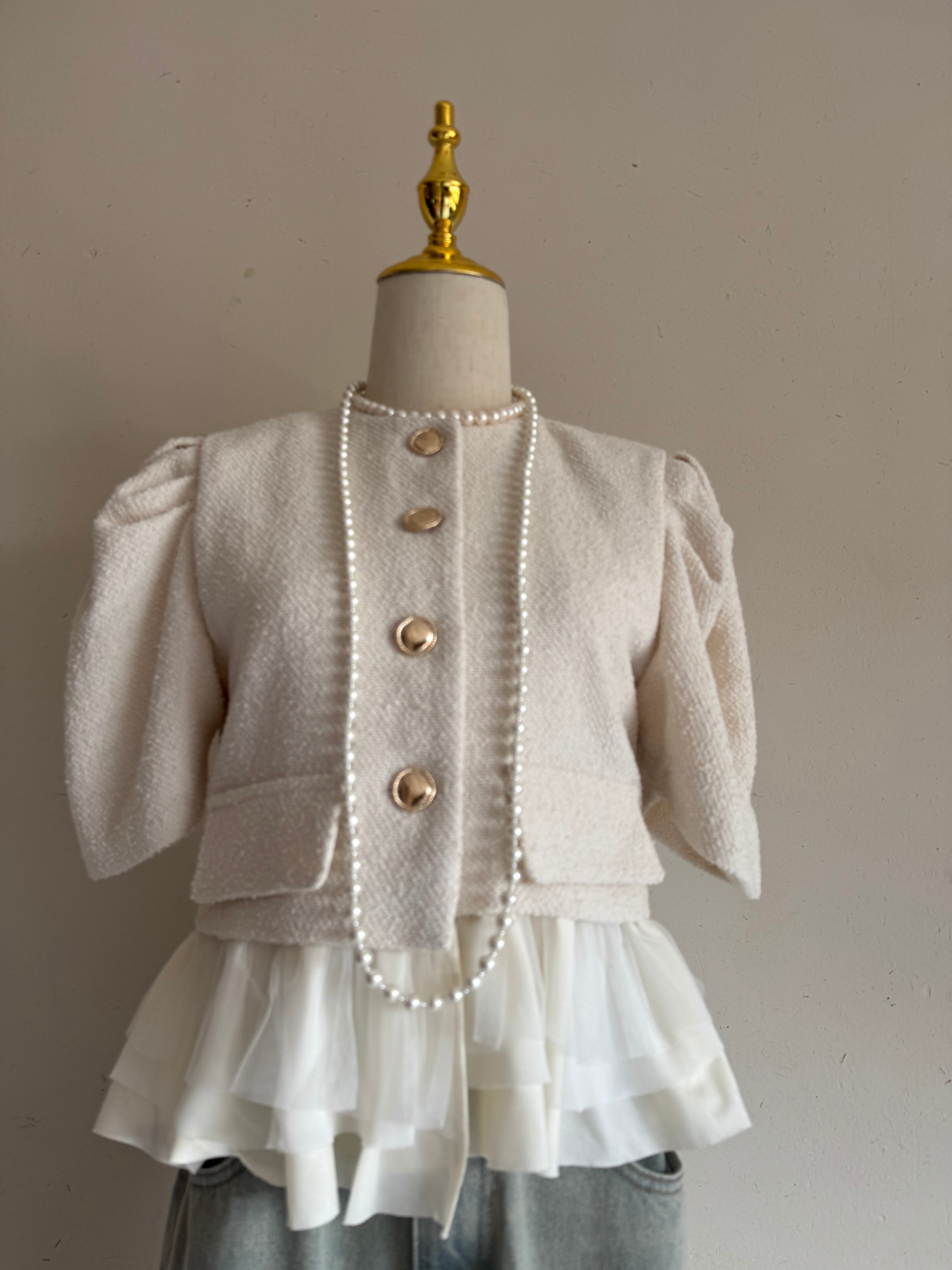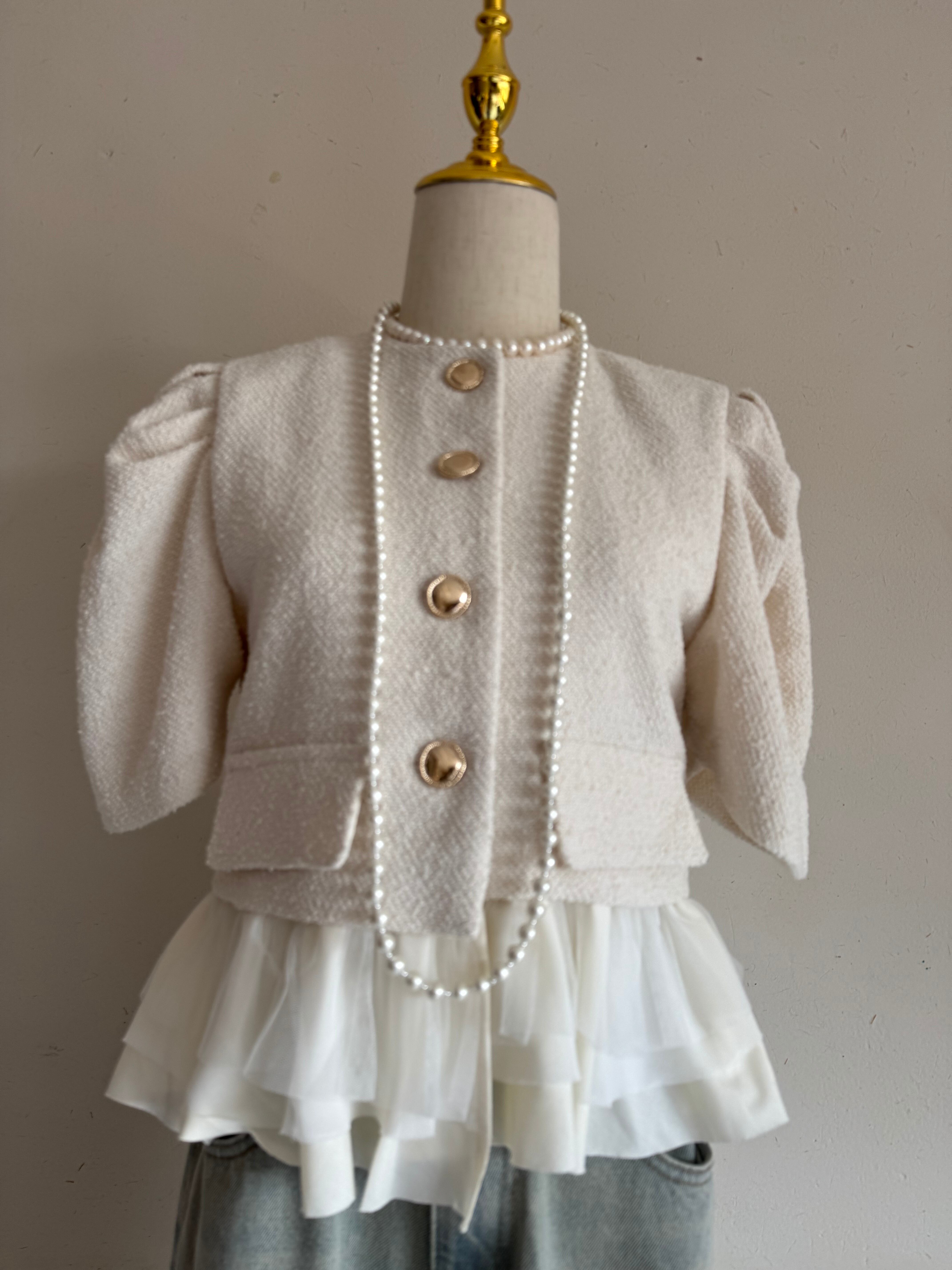 クラシックなツイード素材にボリューム感のあるシフォンフリルをレイヤードした高級感のある半袖ジャケット。ゴールドボタンとパールのディテールが上品さを引き立て、デニムやスカートとも相性抜群です。