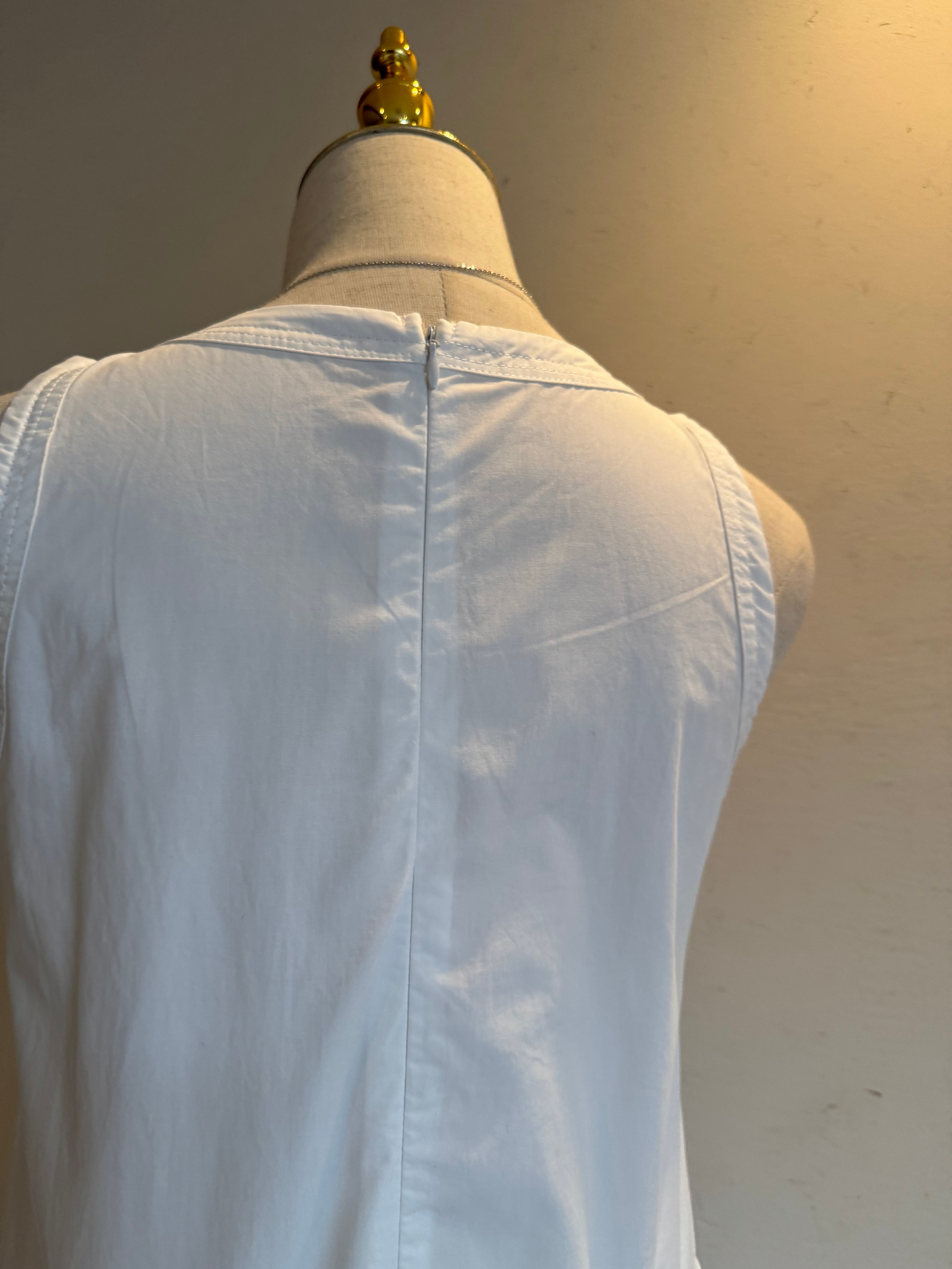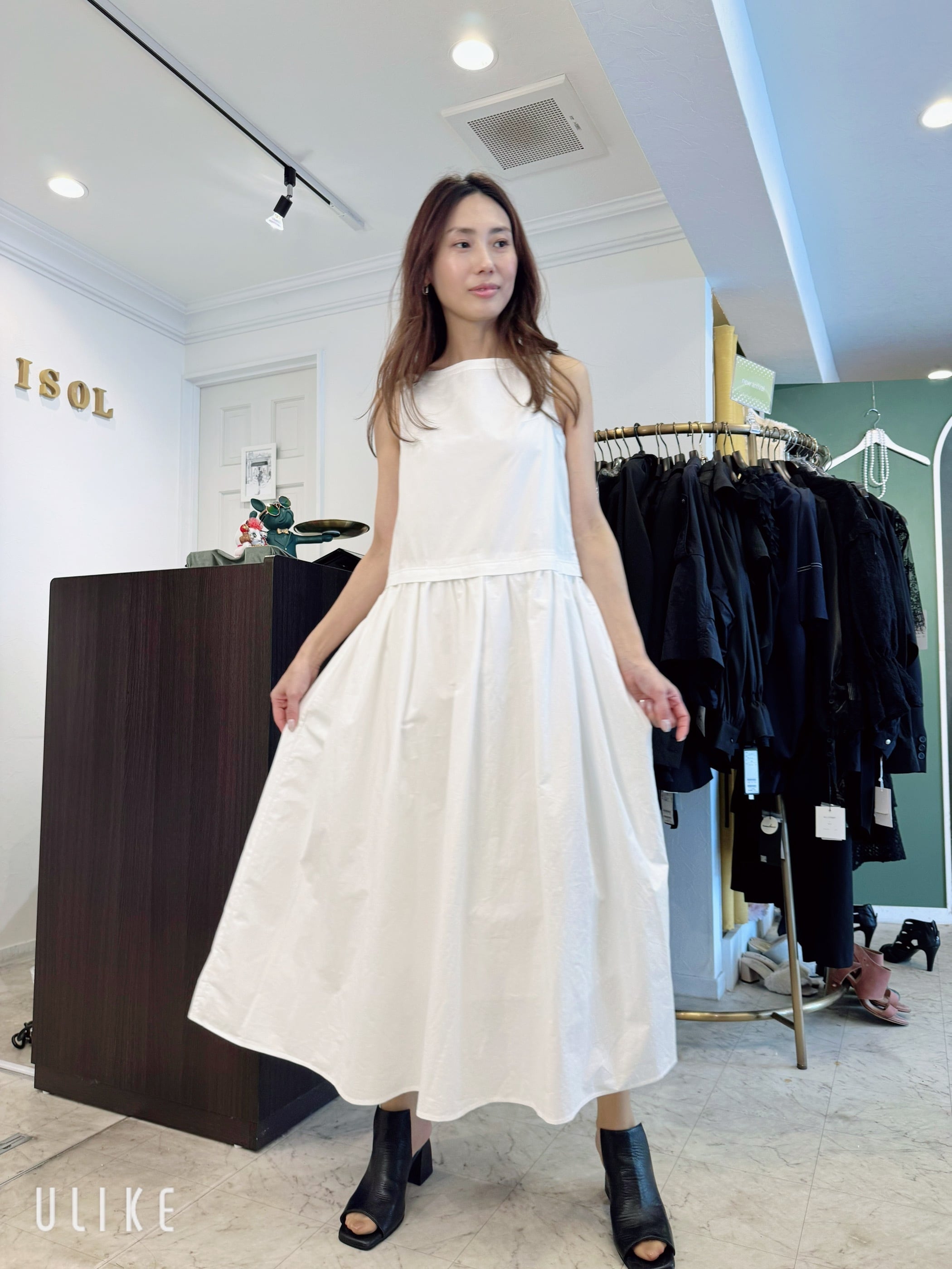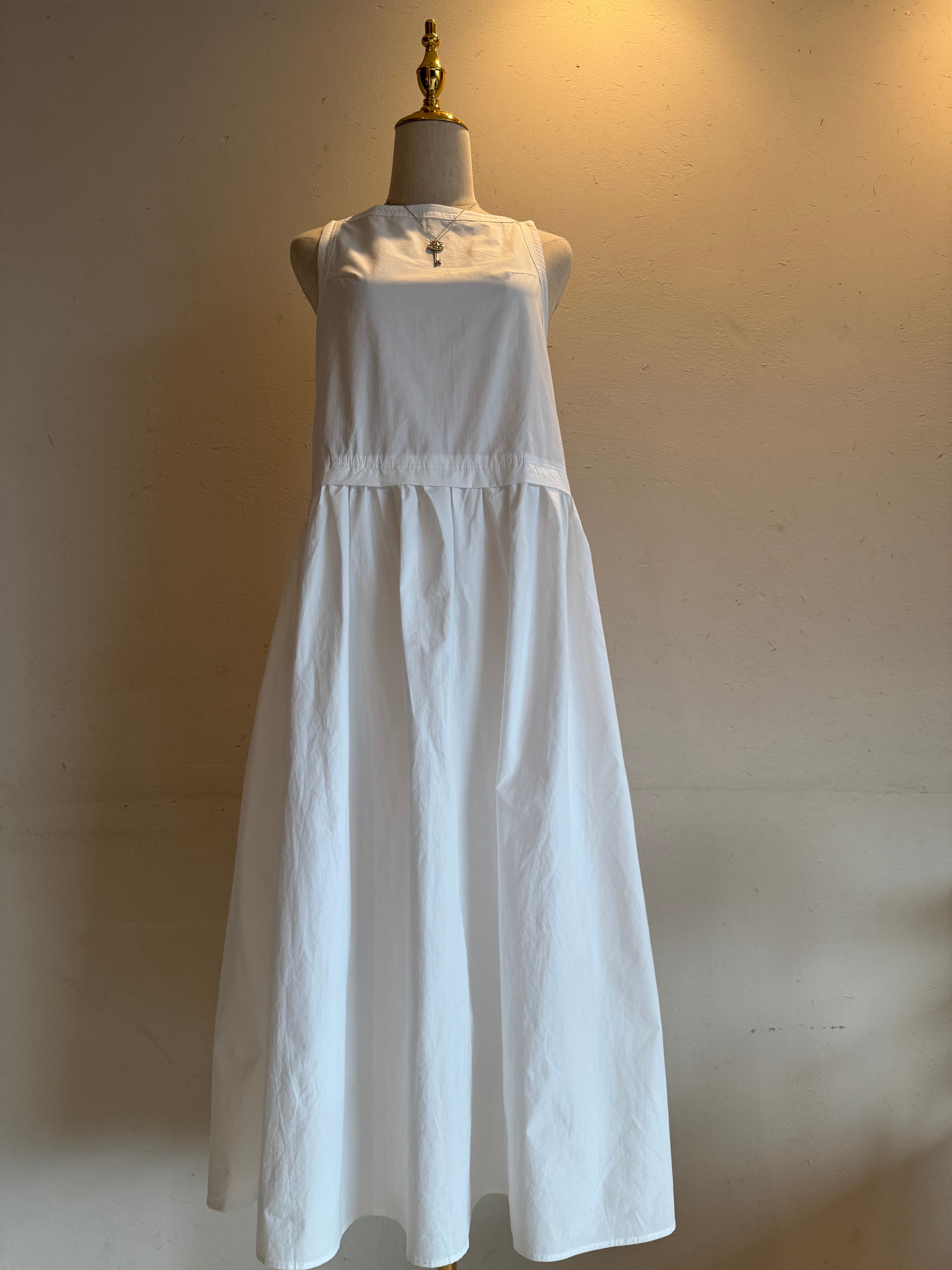 シンプルなラウンドネックにウエストのギャザーがアクセントになったノースリーブのフレアワンピースです。軽やかでしっかりしたコットン素材で、真夏でも涼しく着られます。1枚でも、レイヤードでも楽しめる万能アイテムです.