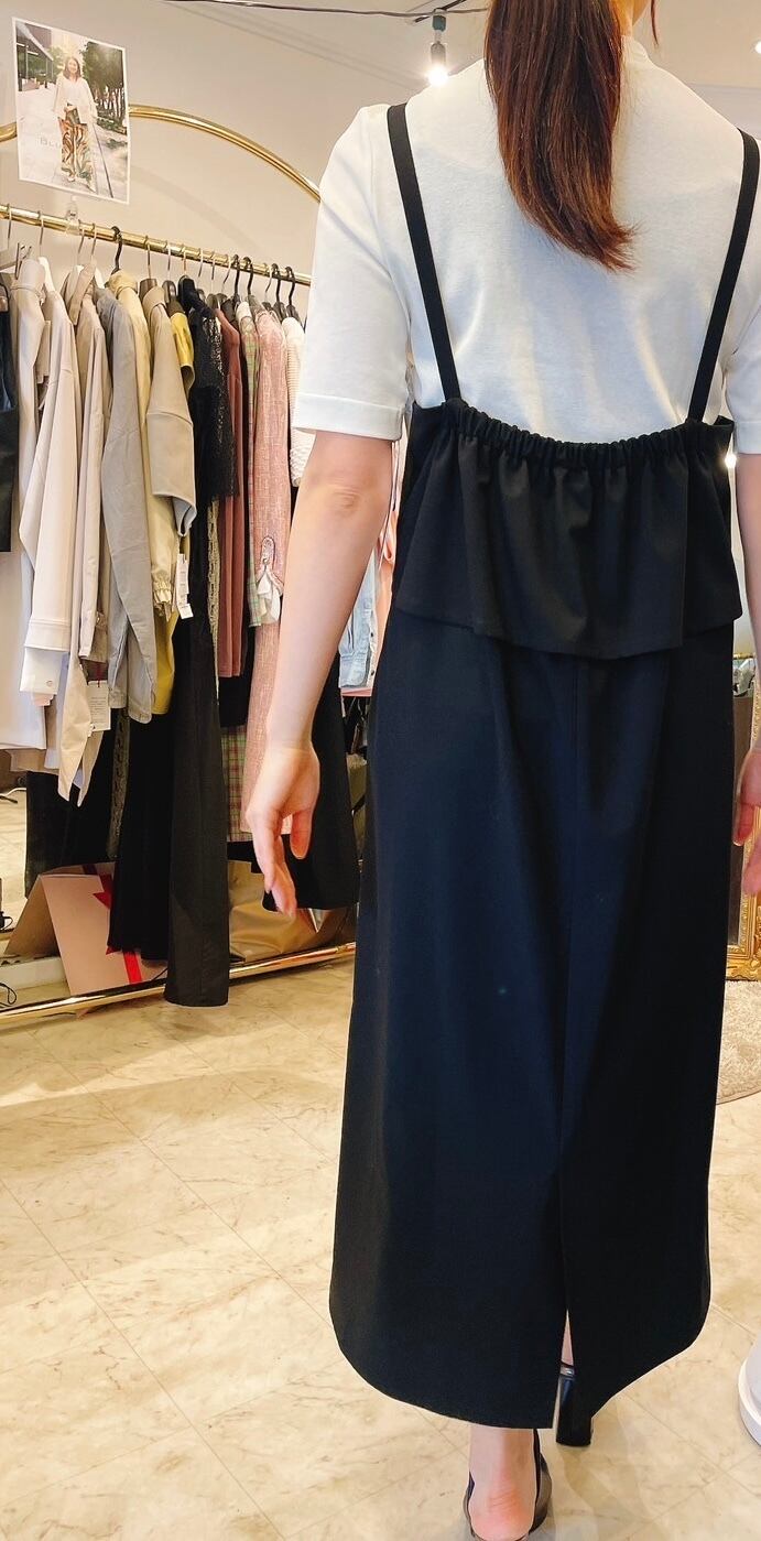 背面はゴムギャザー仕様で、体に自然にフィットしながらも締めつけ感がなく、リラックスした着心地を実現。スカート部分は足首が見える長めの丈感で、フラットシューズやヒールどちらでもバランスよく決まります。