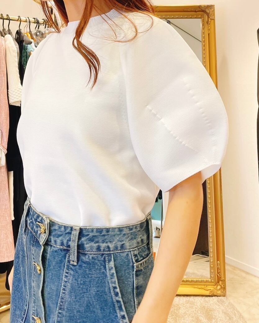 ボリューム感のあるパフスリーブが目を引く、立体シルエットが魅力のカットソーです。