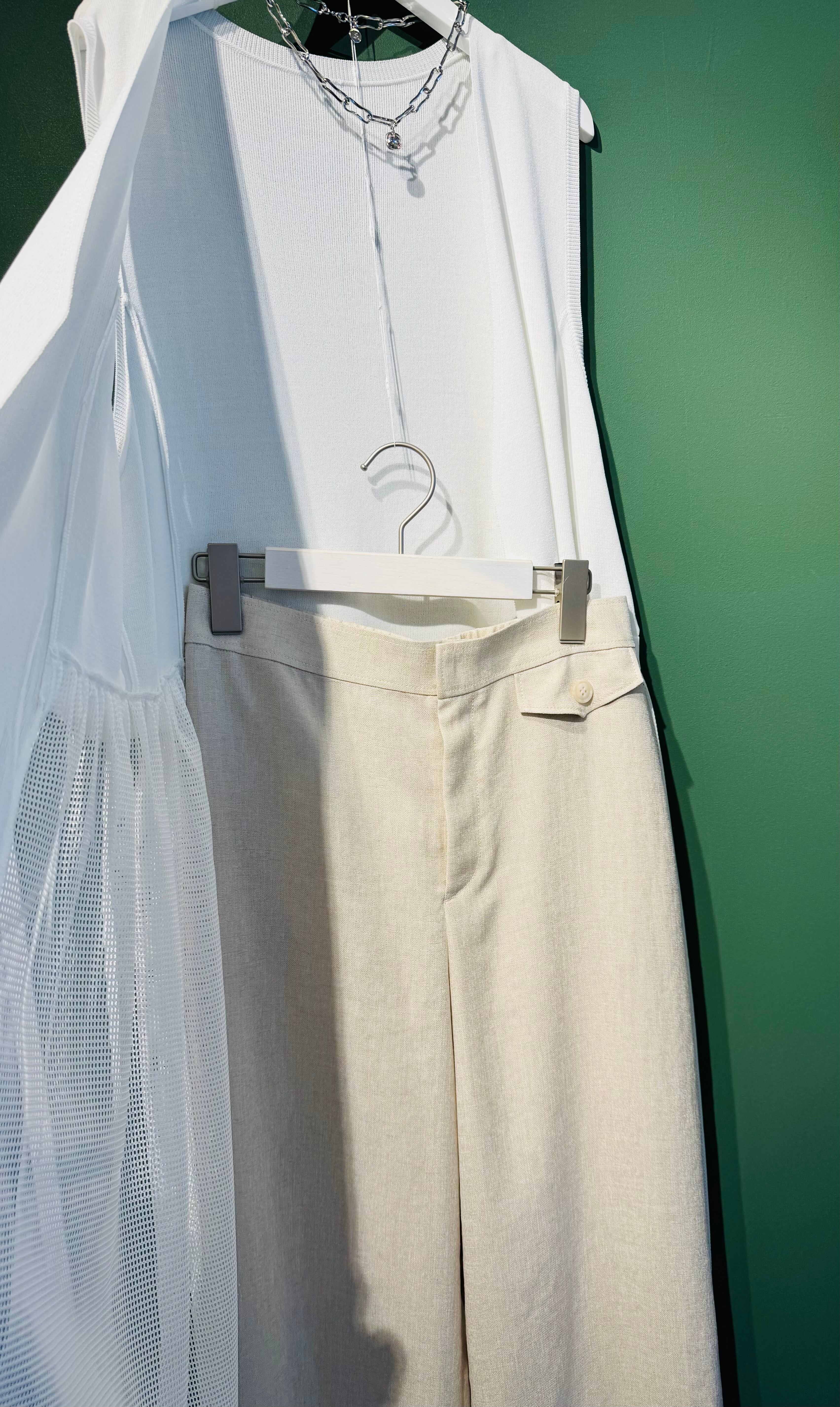 涼しげなリネン混素材を使用したナチュラルカラーのワイドパンツ。