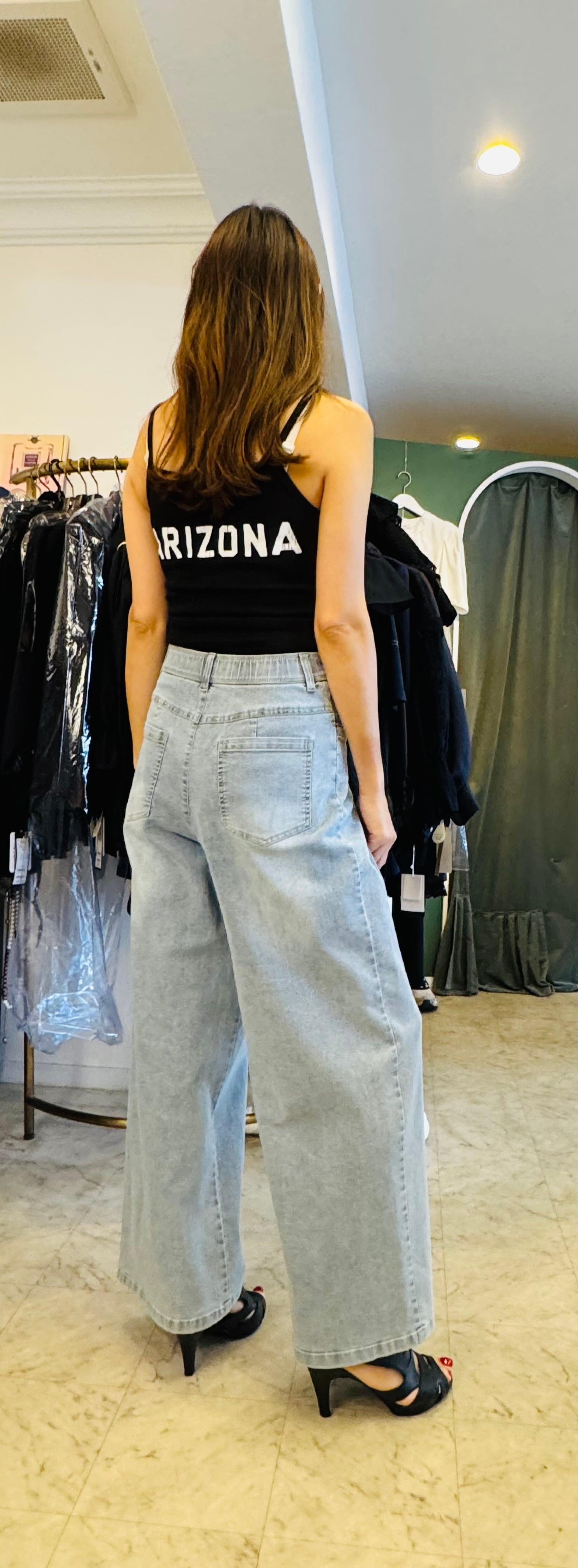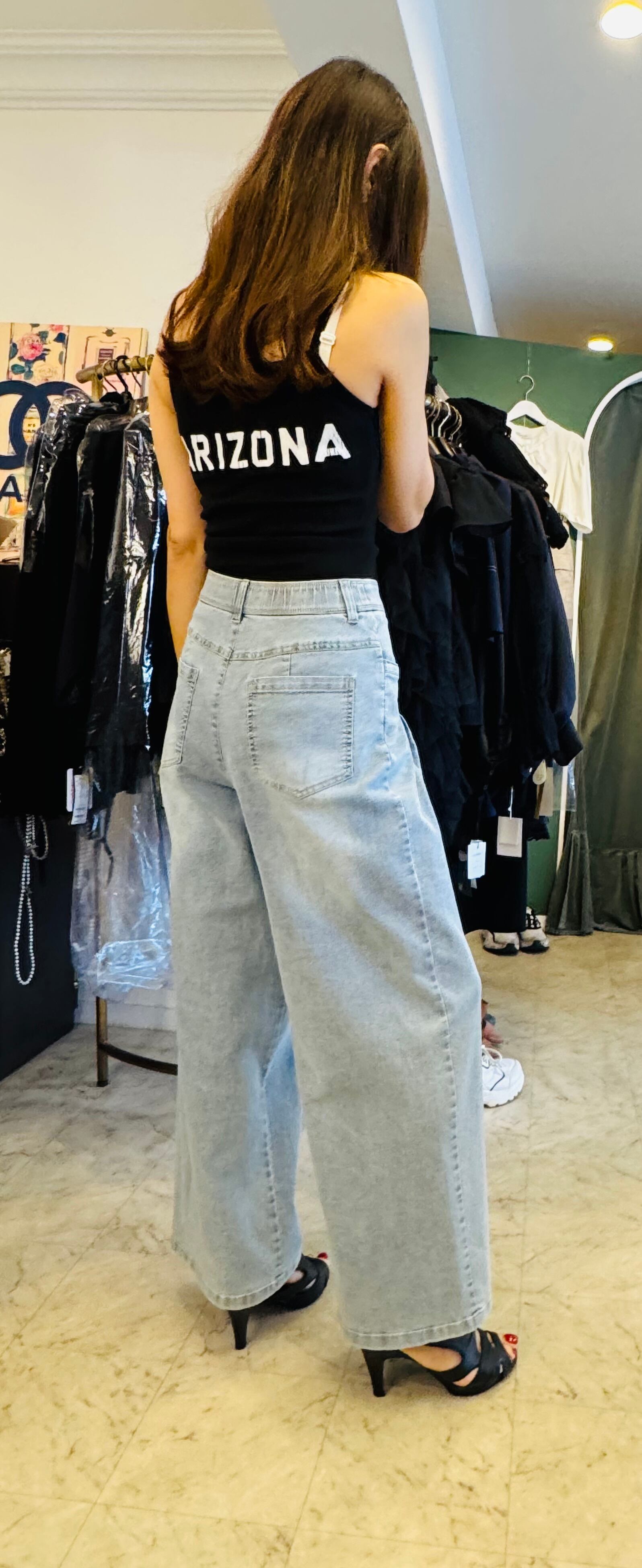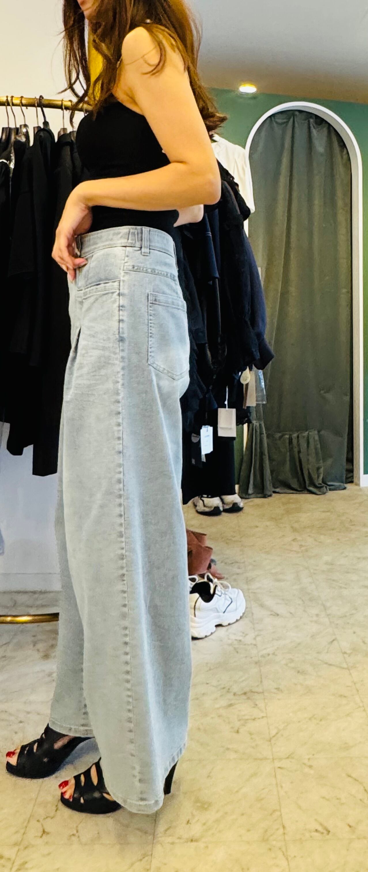 산뜻한 연청 워싱과 볼륨감 있는 턱 디테일이 조화를 이루는 하이웨이스트 와이드 데님 팬츠입니다.