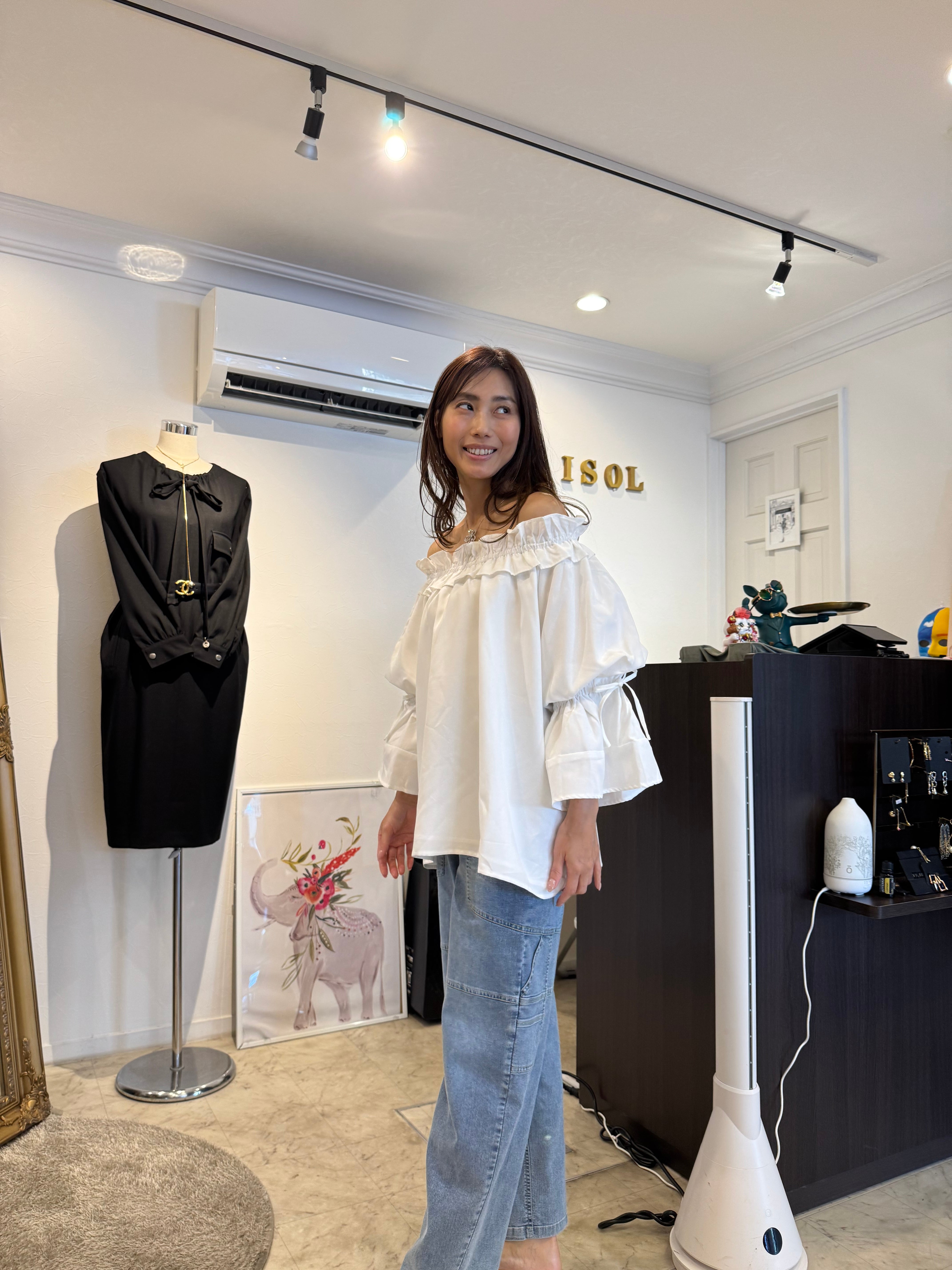 フリルのネックラインがポイントのオフショルダーブラウスです。