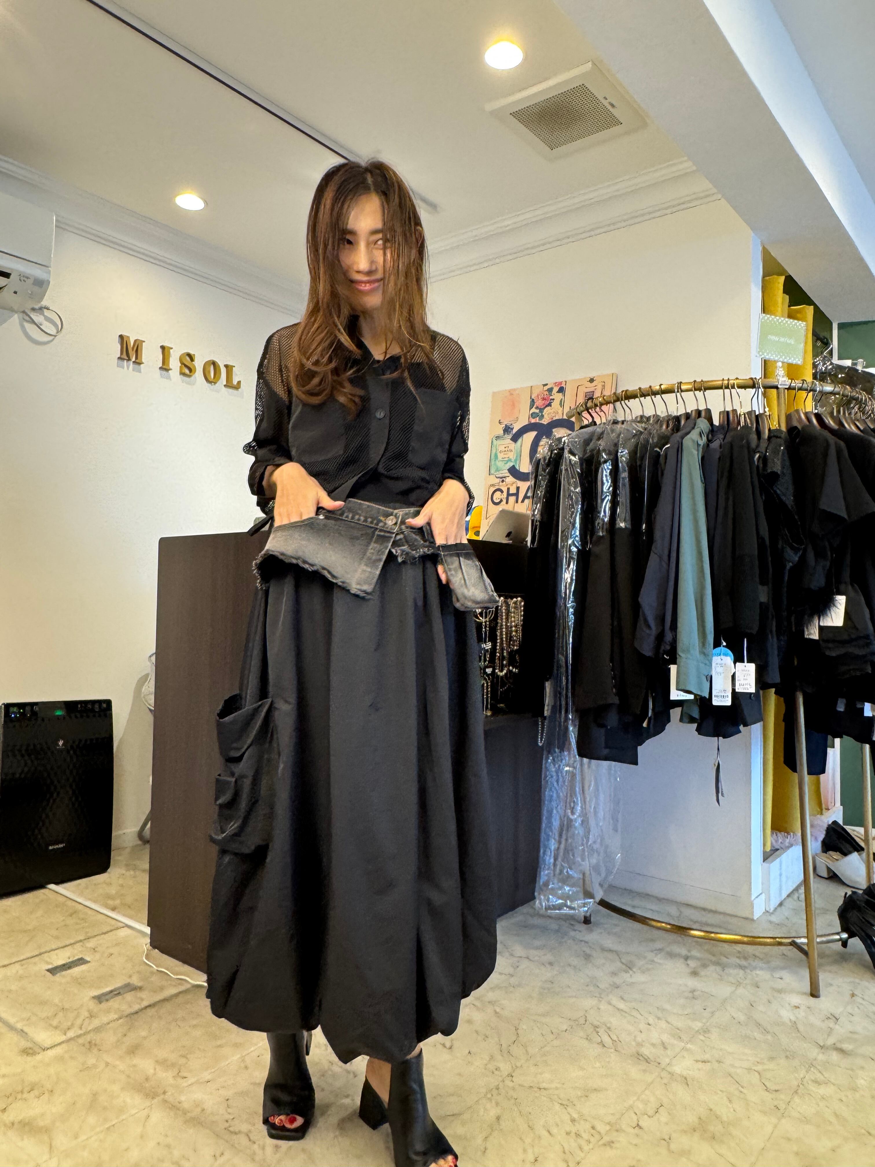 ウエスト部分にヴィンテージ風デニムのウエストラインとポケットがレイヤードされたようなデザインが特徴のスカートです。