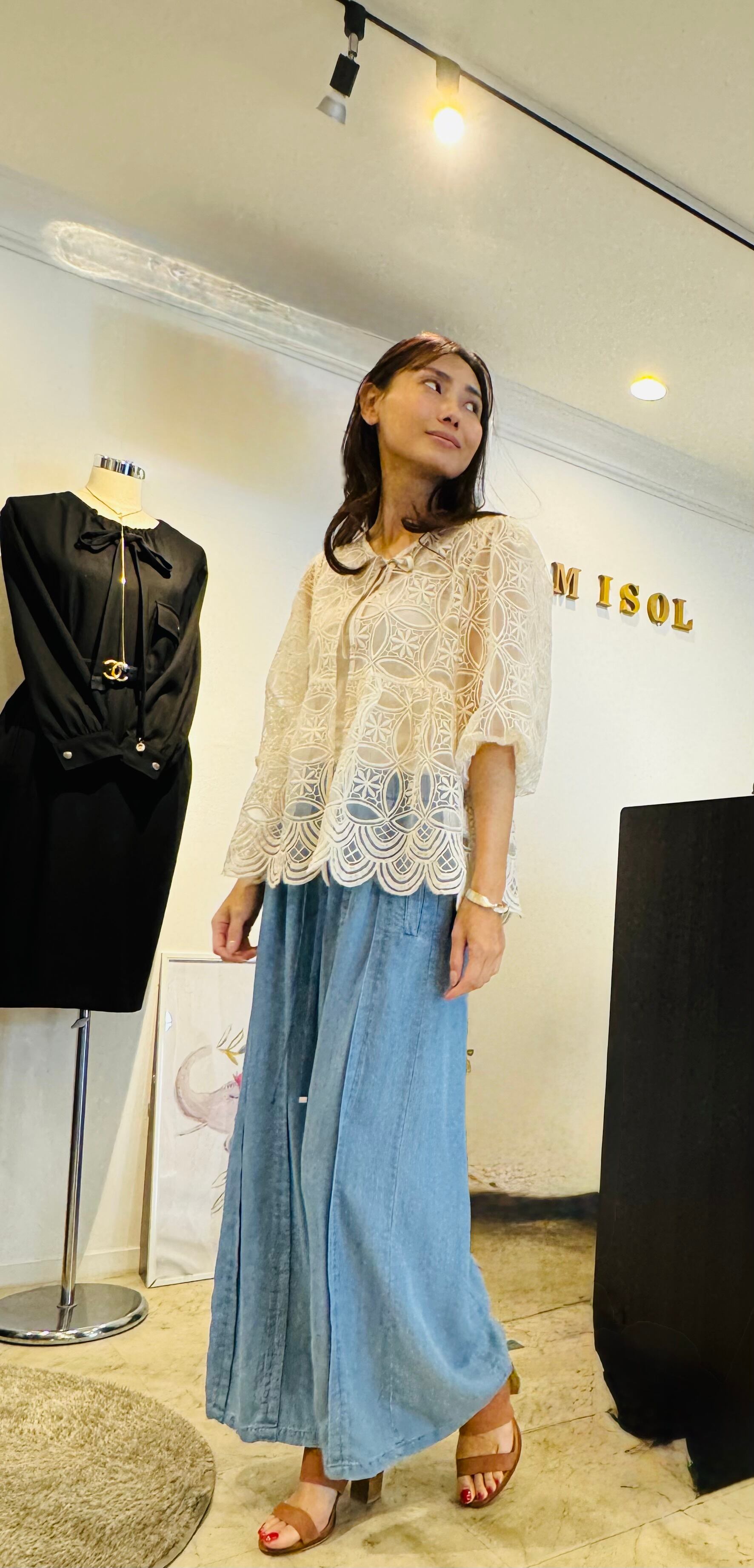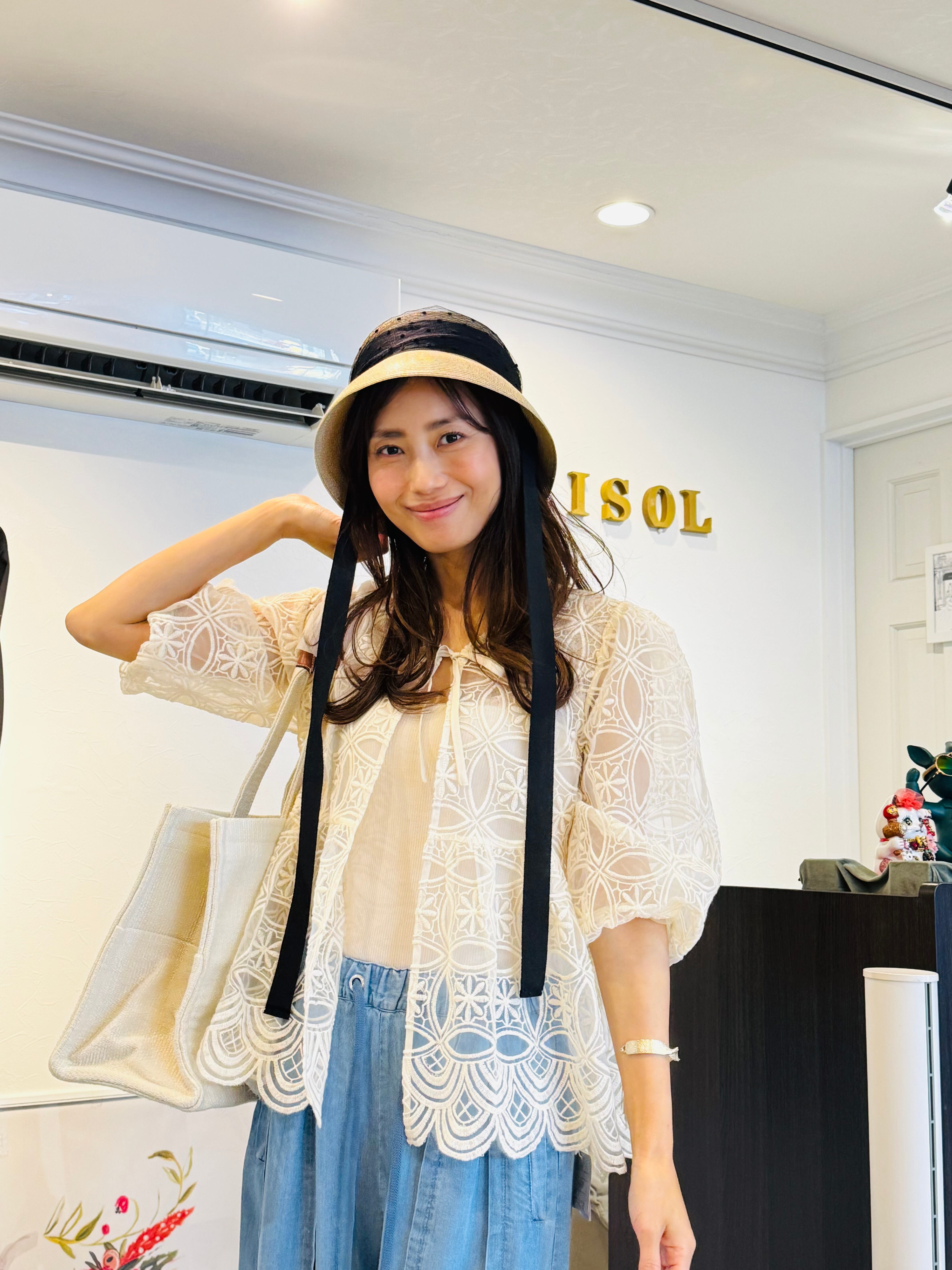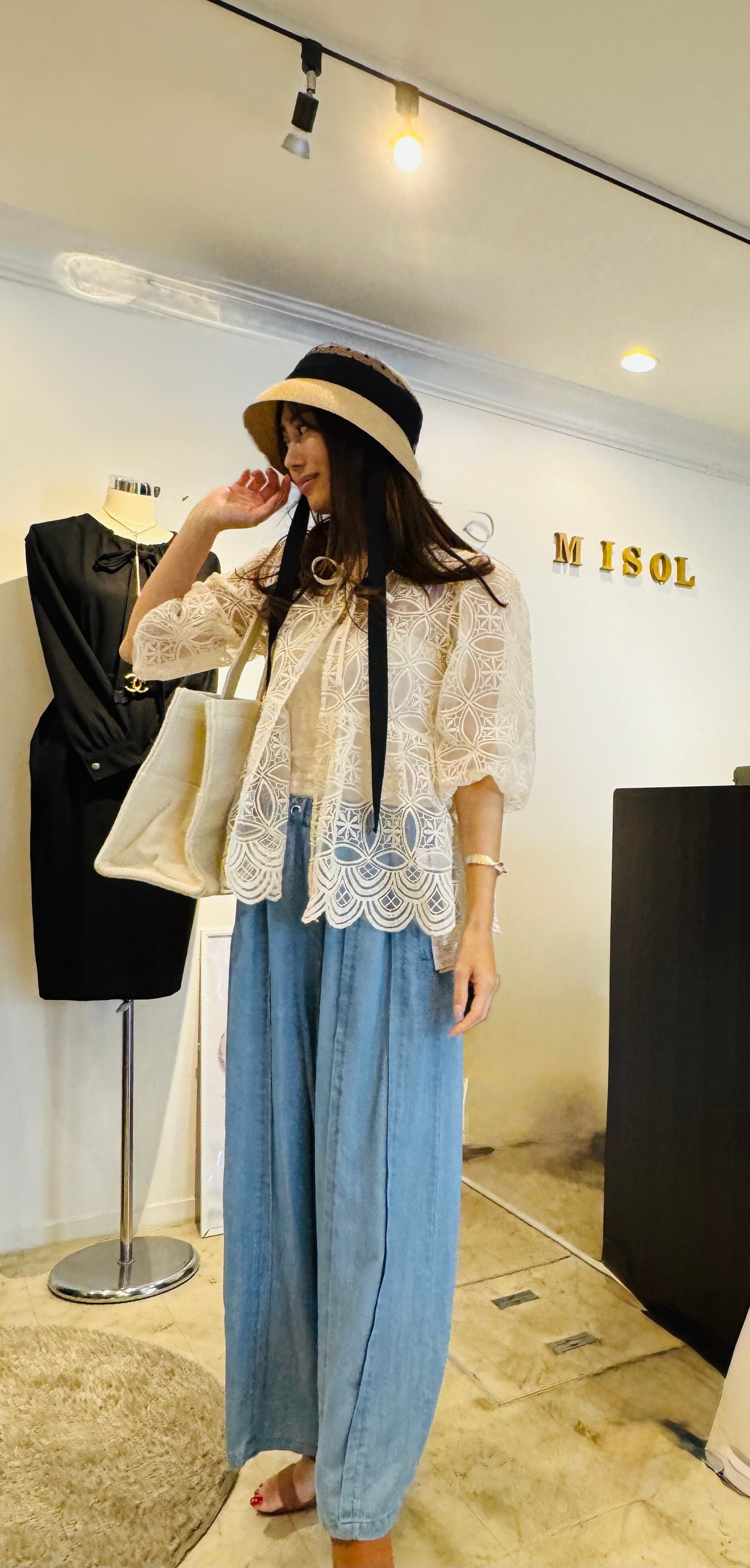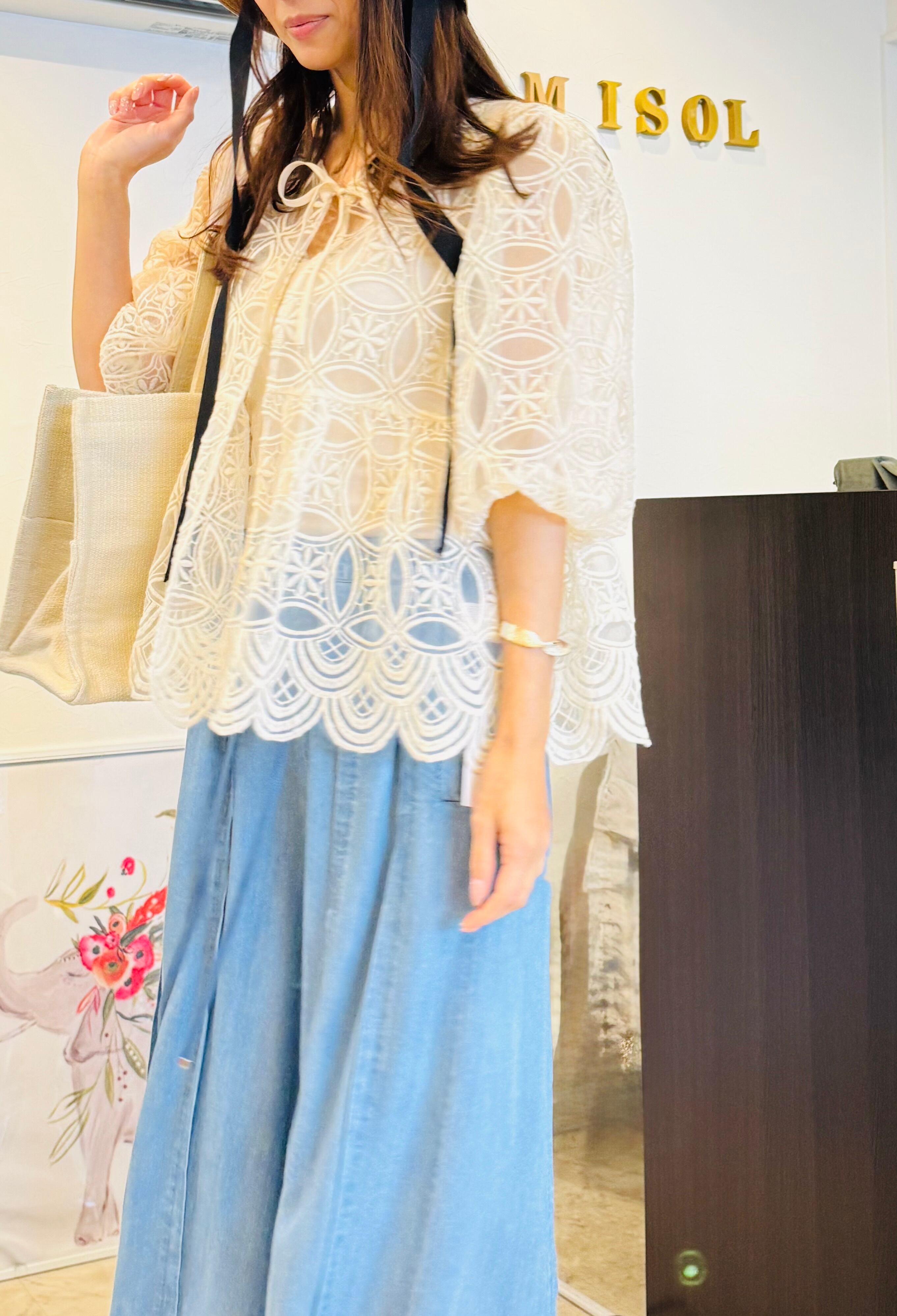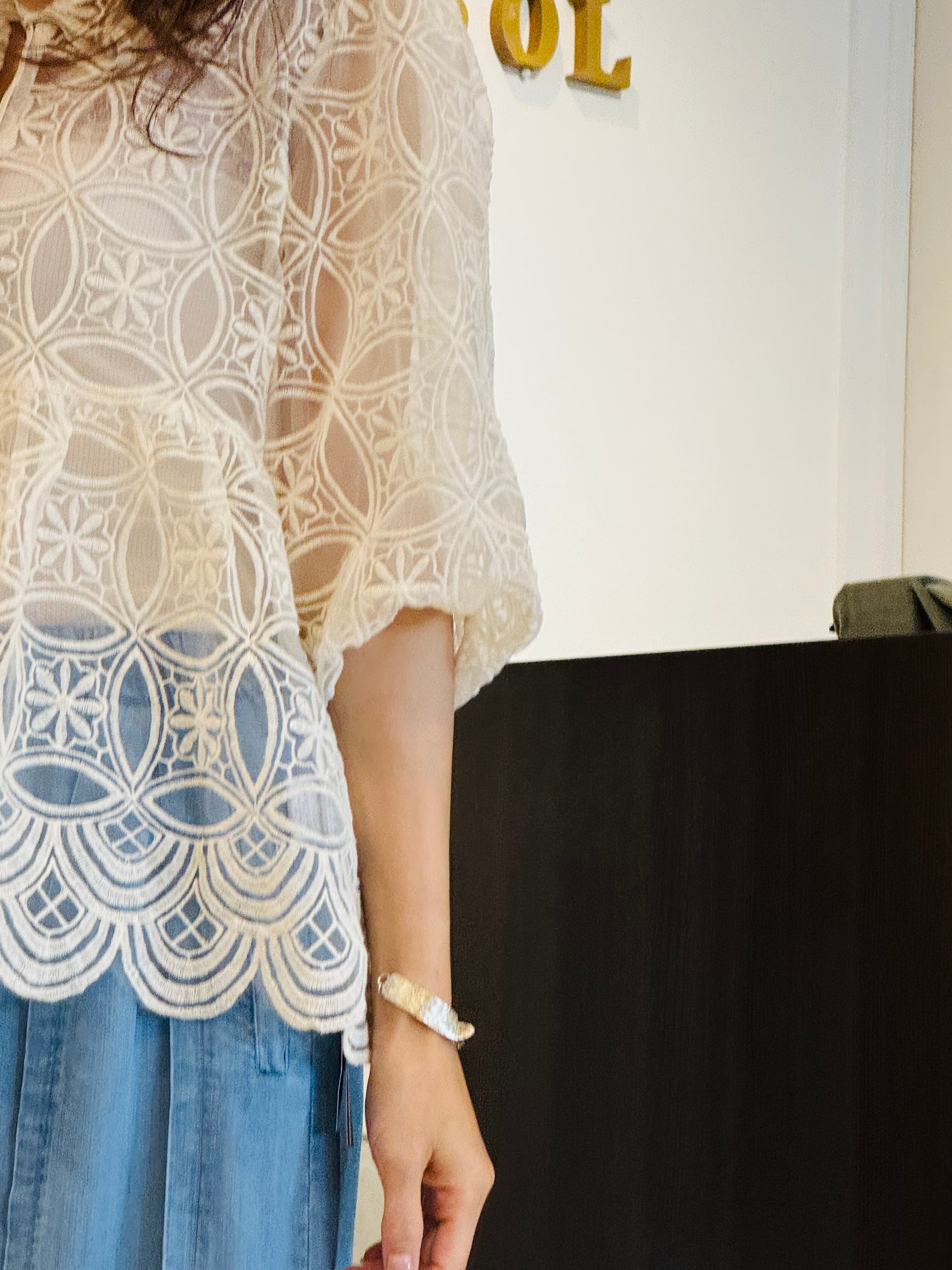 優しいアイボリートーンのシースルーブラウス。全体に繊細な刺繍が施され、裾のスカラップディテールがエレガントなシルエットを演出します。七分袖とゆったりしたサイズ感で体型カバーにも最適。フロントのリボンタイがフェミニンなアクセントになっています。