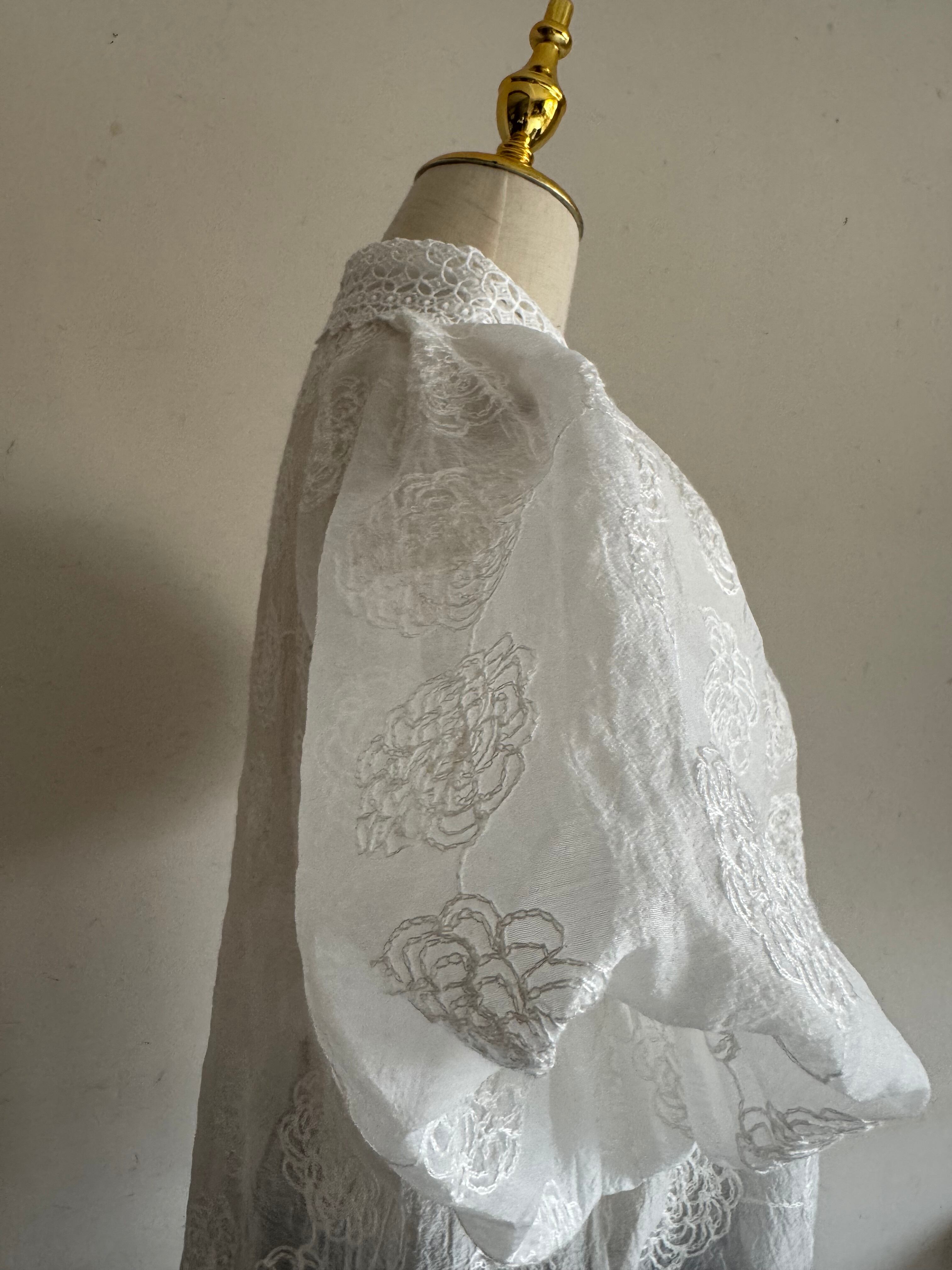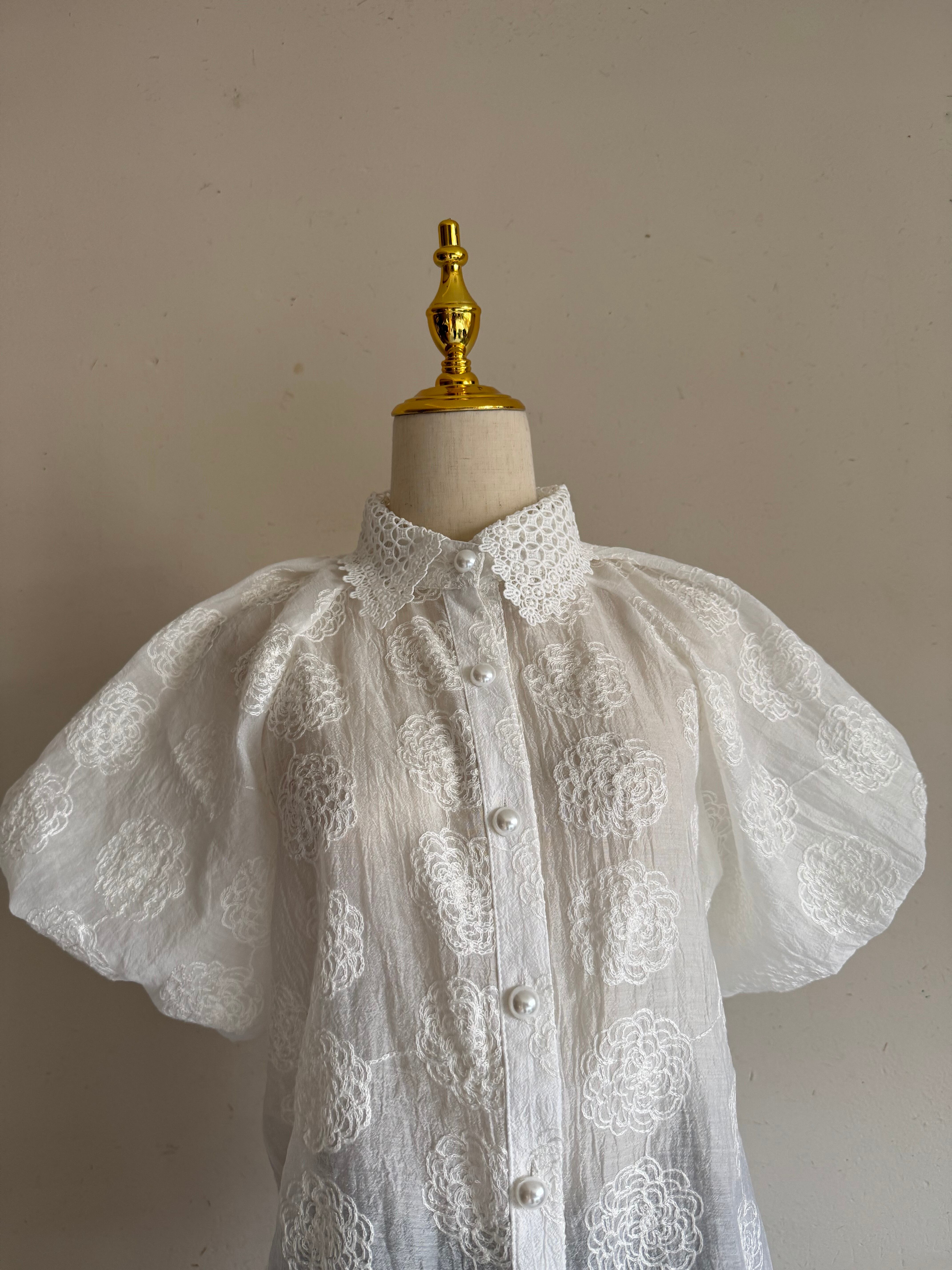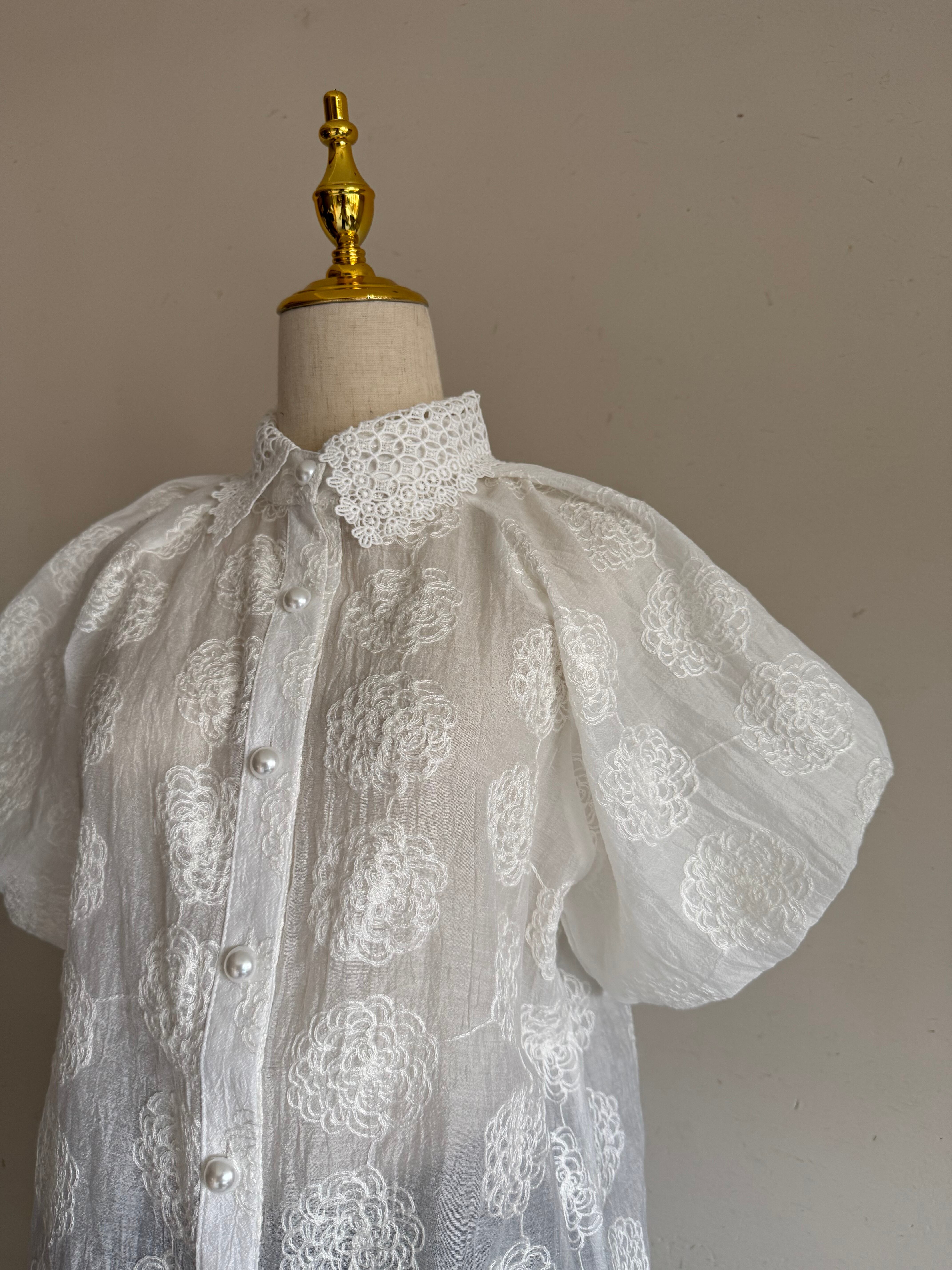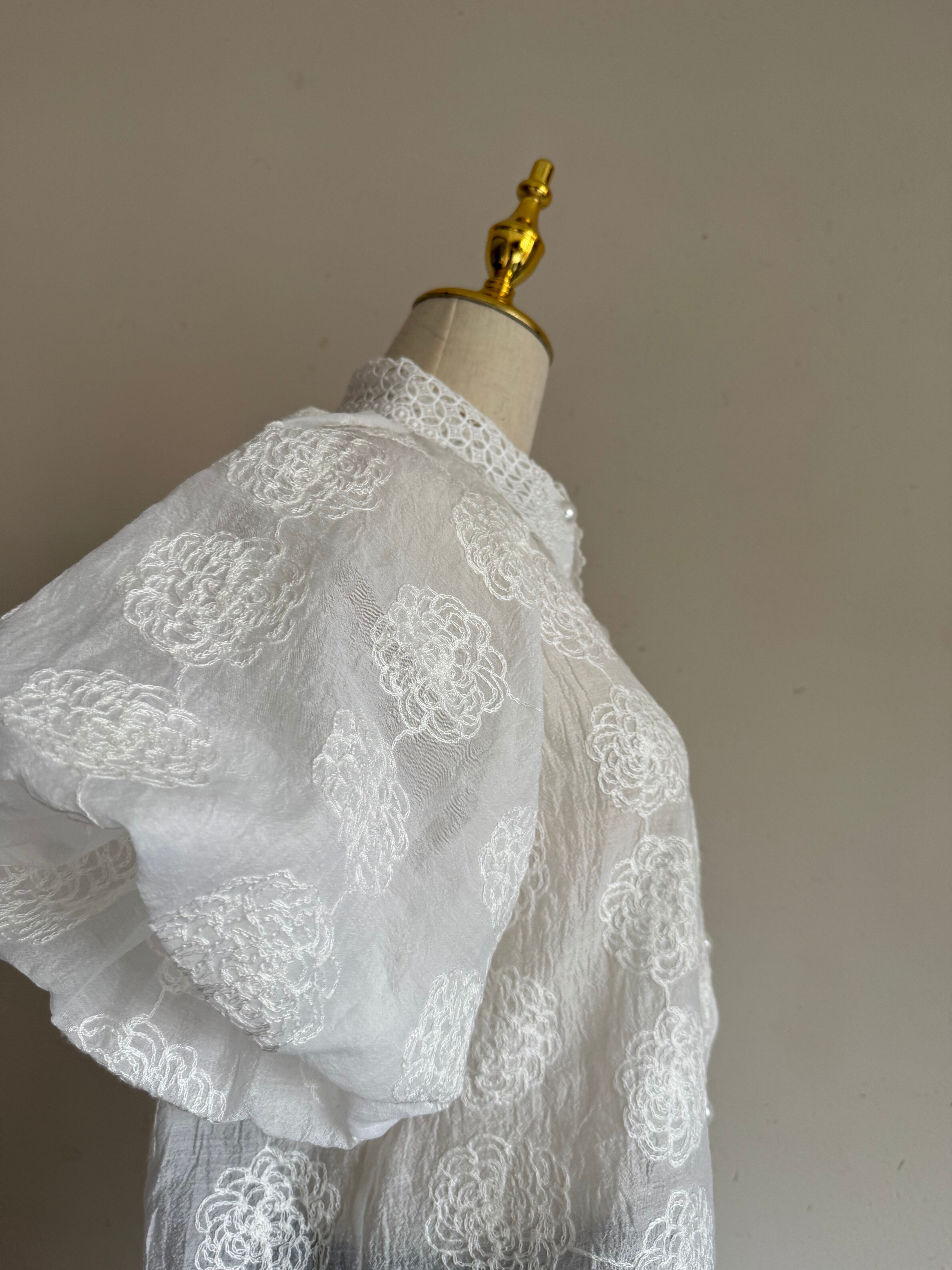 繊細なローズ刺繍が全面に施された、エアリーな素材感のパフスリーブブラウスです。