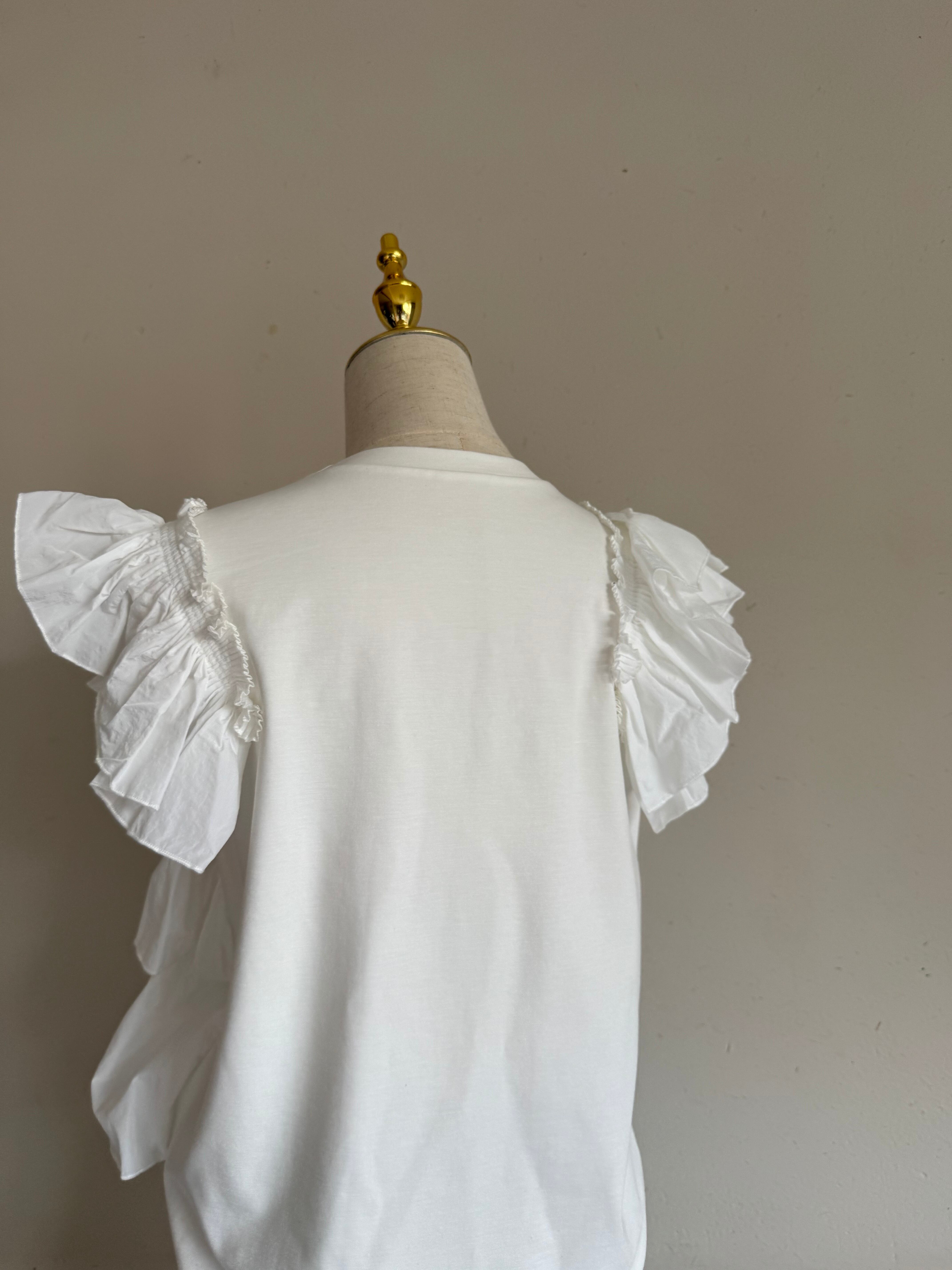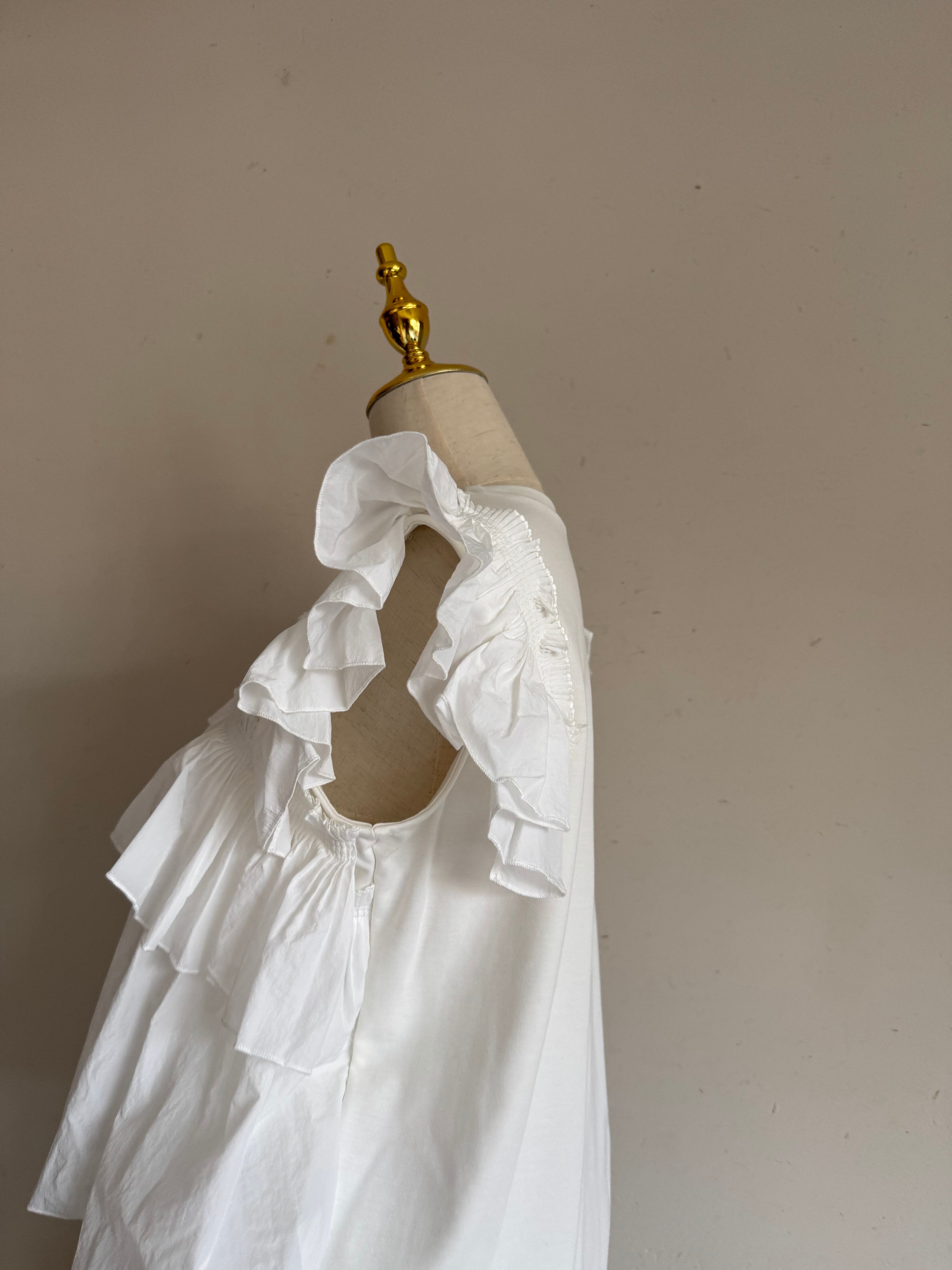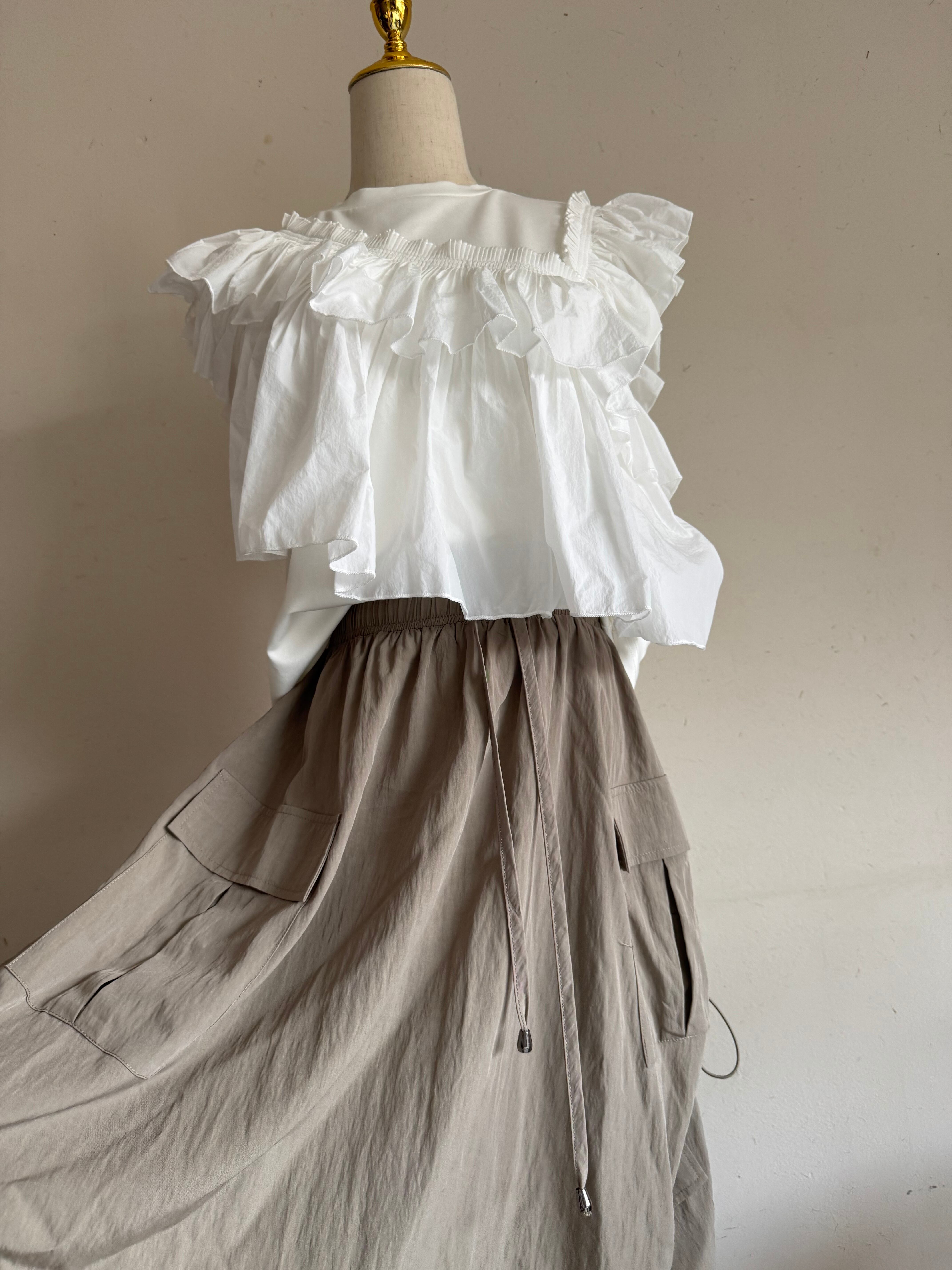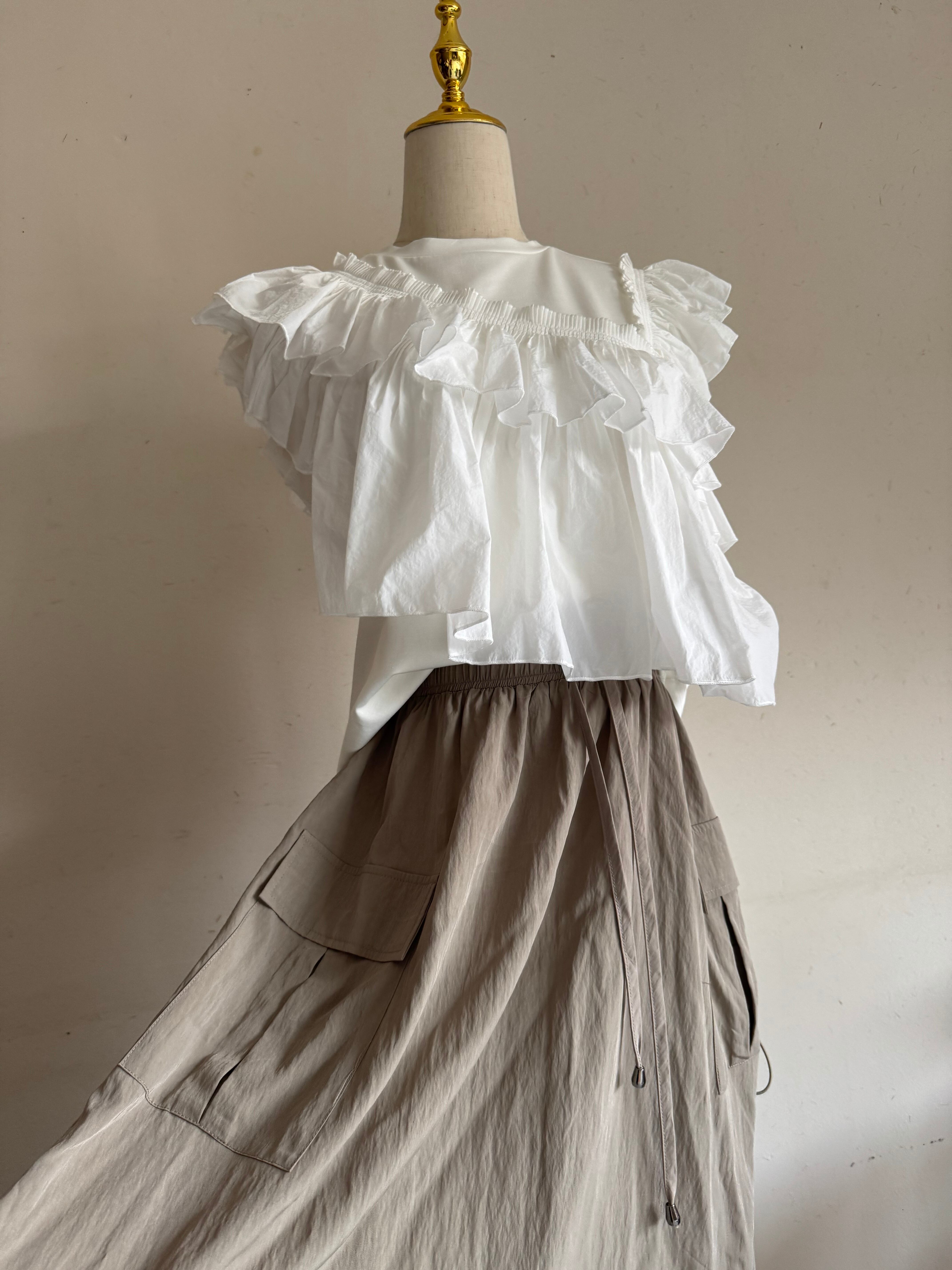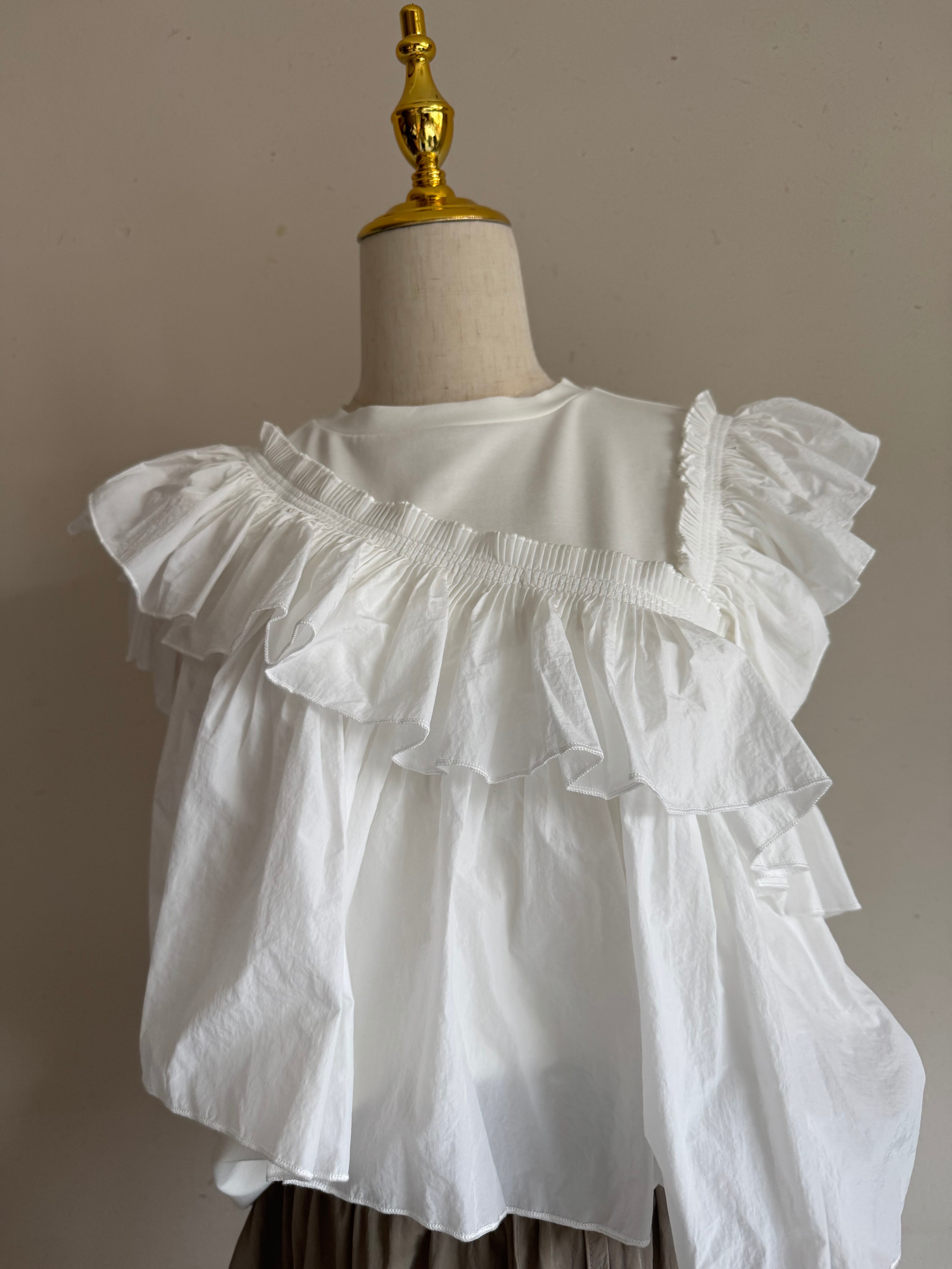 左右非対称の大胆なフリルデザインが印象的なノースリーブトップス。