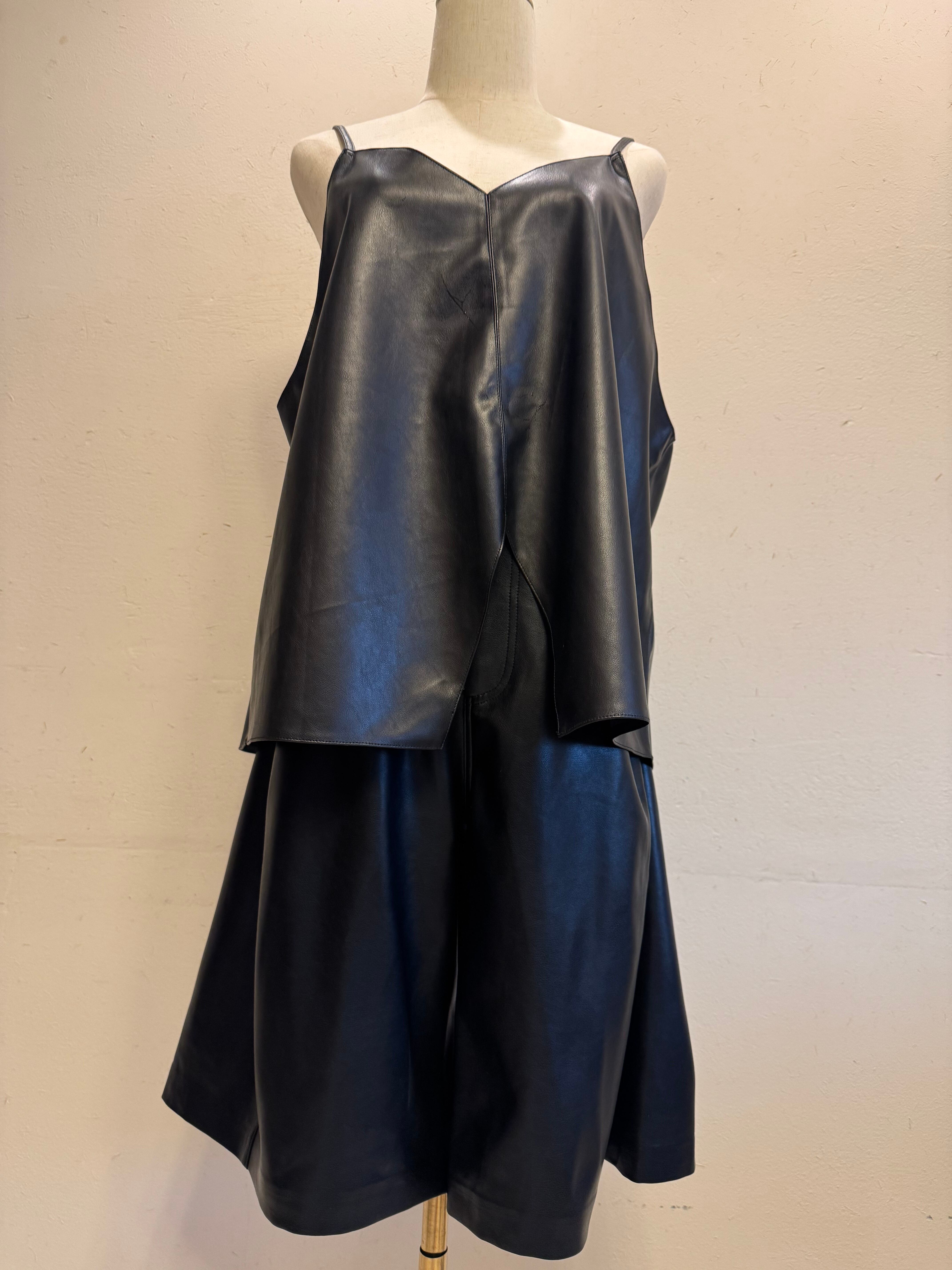 光沢感のあるブラックレザー素材を使用したスリーブレスタップです。フロントはシンプルなVネックで洗練された印象を与え、バックスタイルはクロスオーバーデザインとボタンディテールがポイントになっています。ルーズなシルエットで、快適さとモード感を兼ね備えたアイテムです。