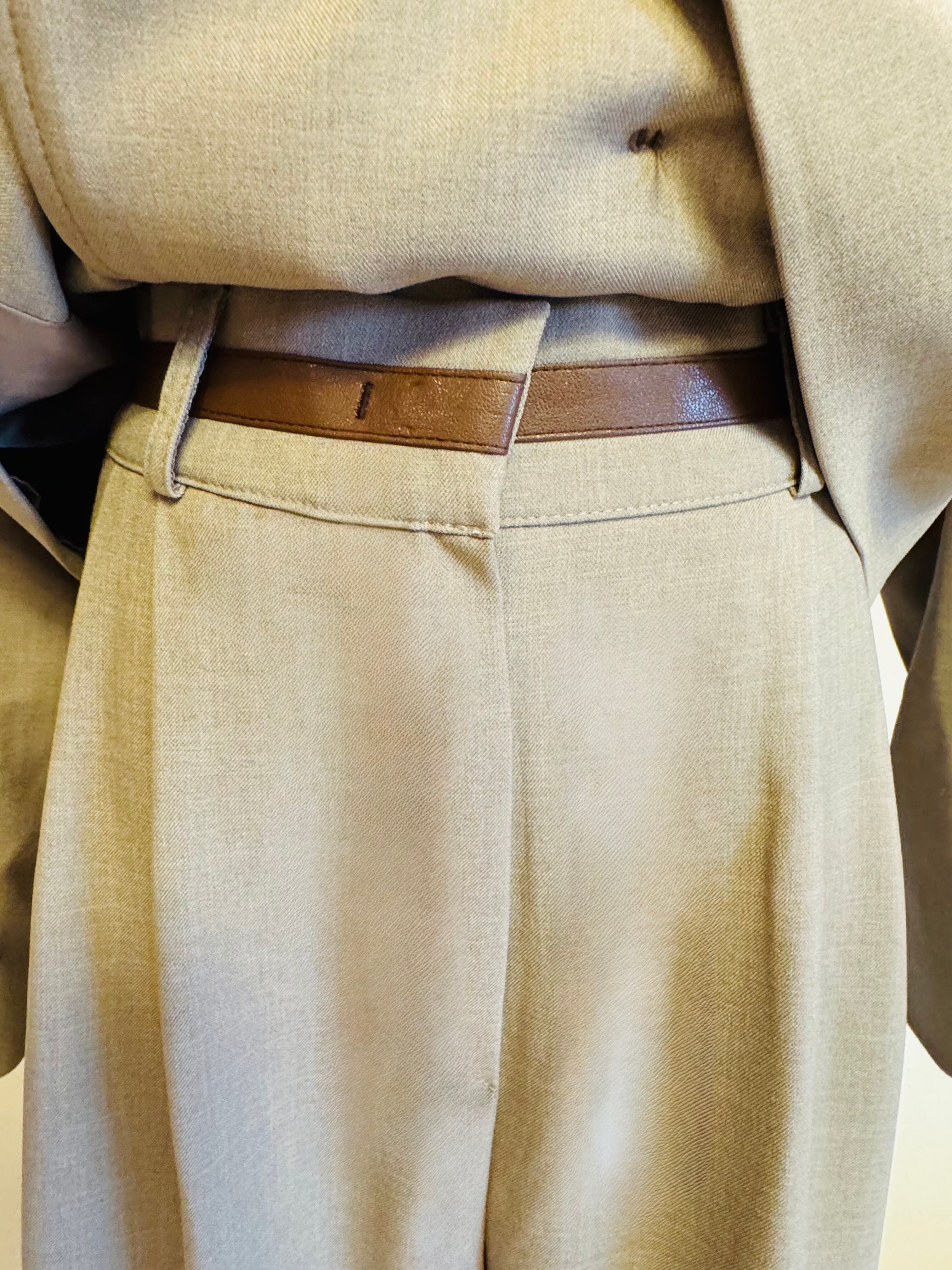 トレンチコートのエッセンスを取り入れた、ジャケットとワイドパンツのセットアップです。上品なライトベージュカラーと洗練されたシルエットが相まって、都会的でエレガントな雰囲気を演出します。