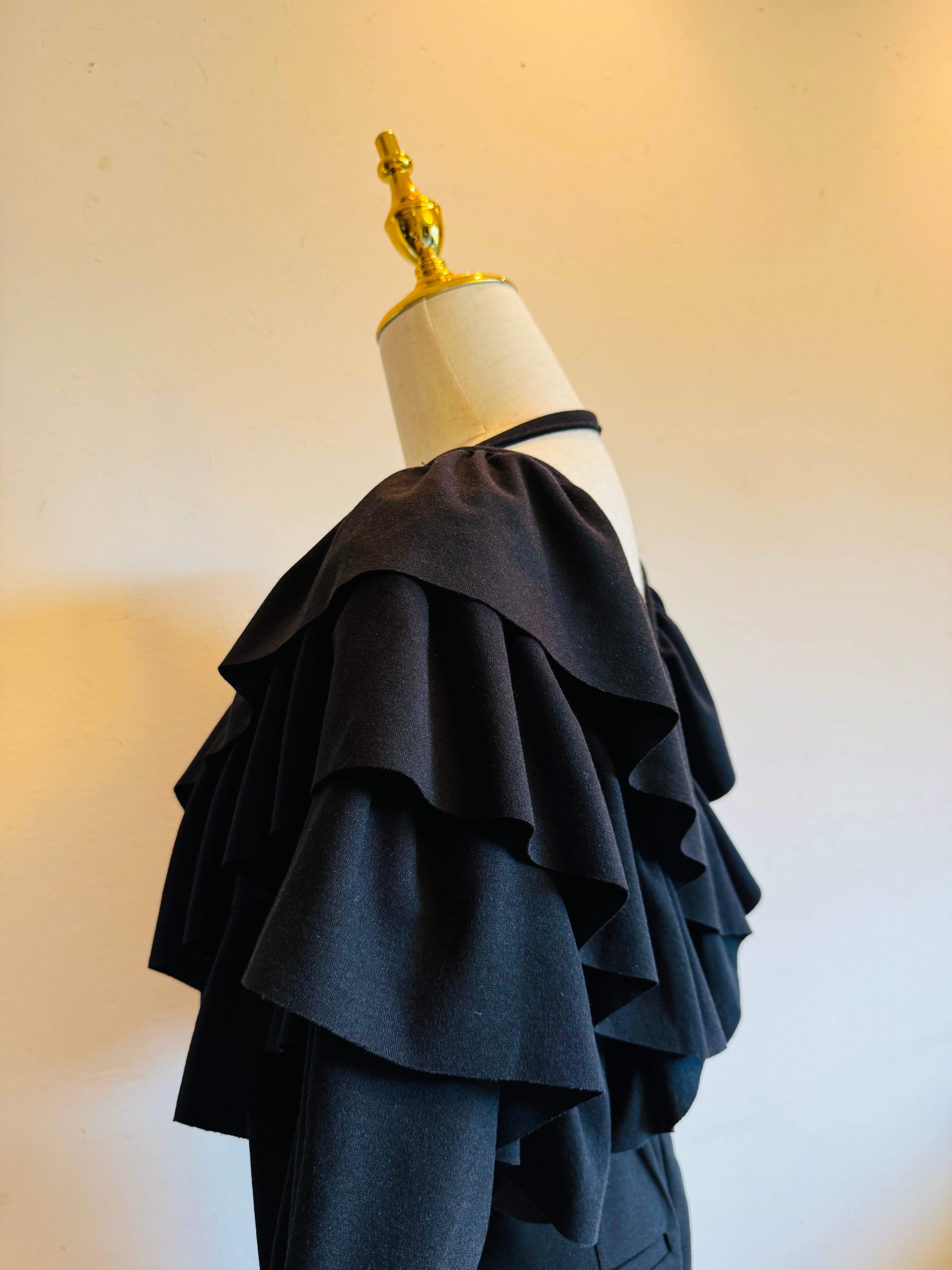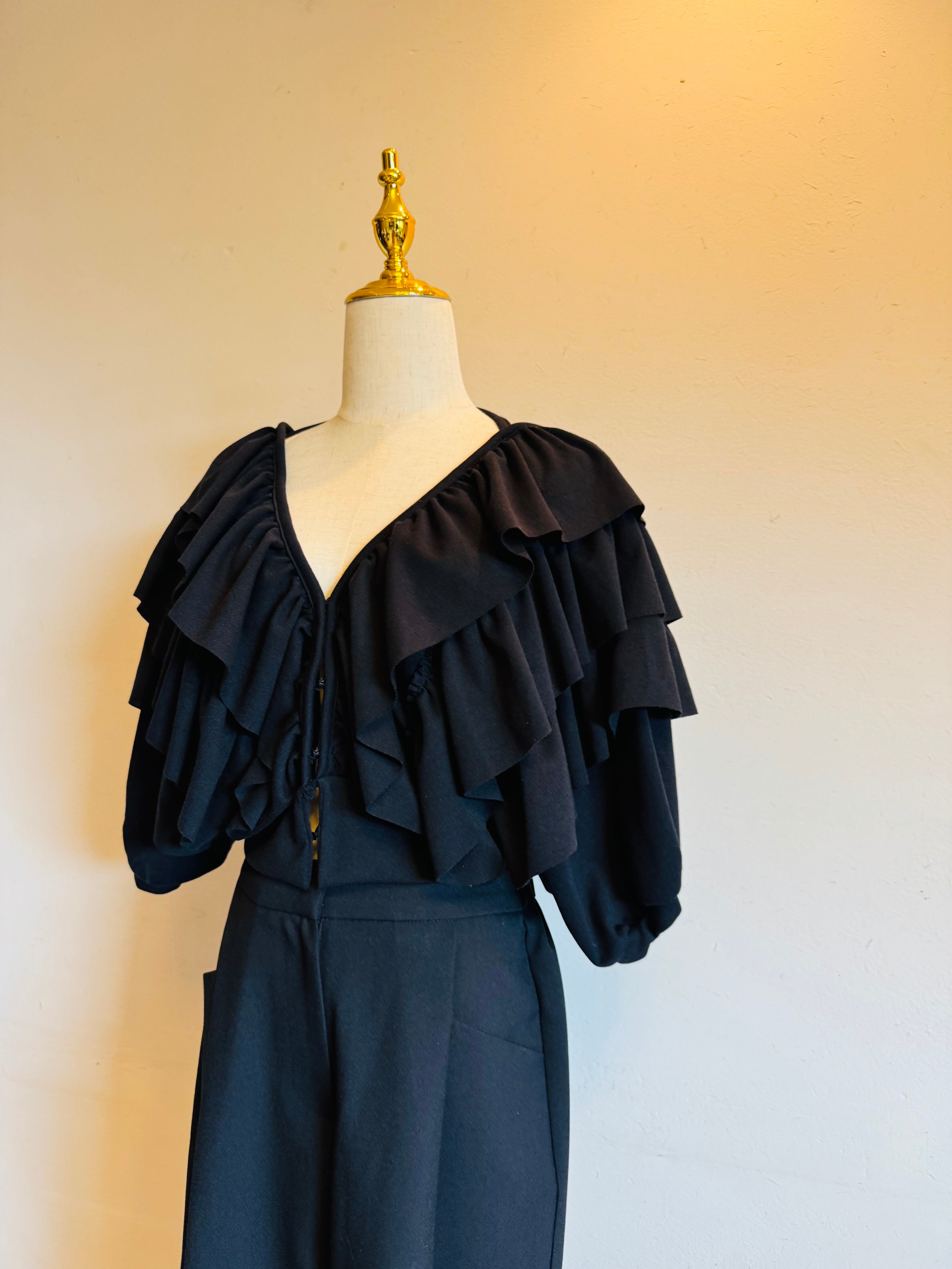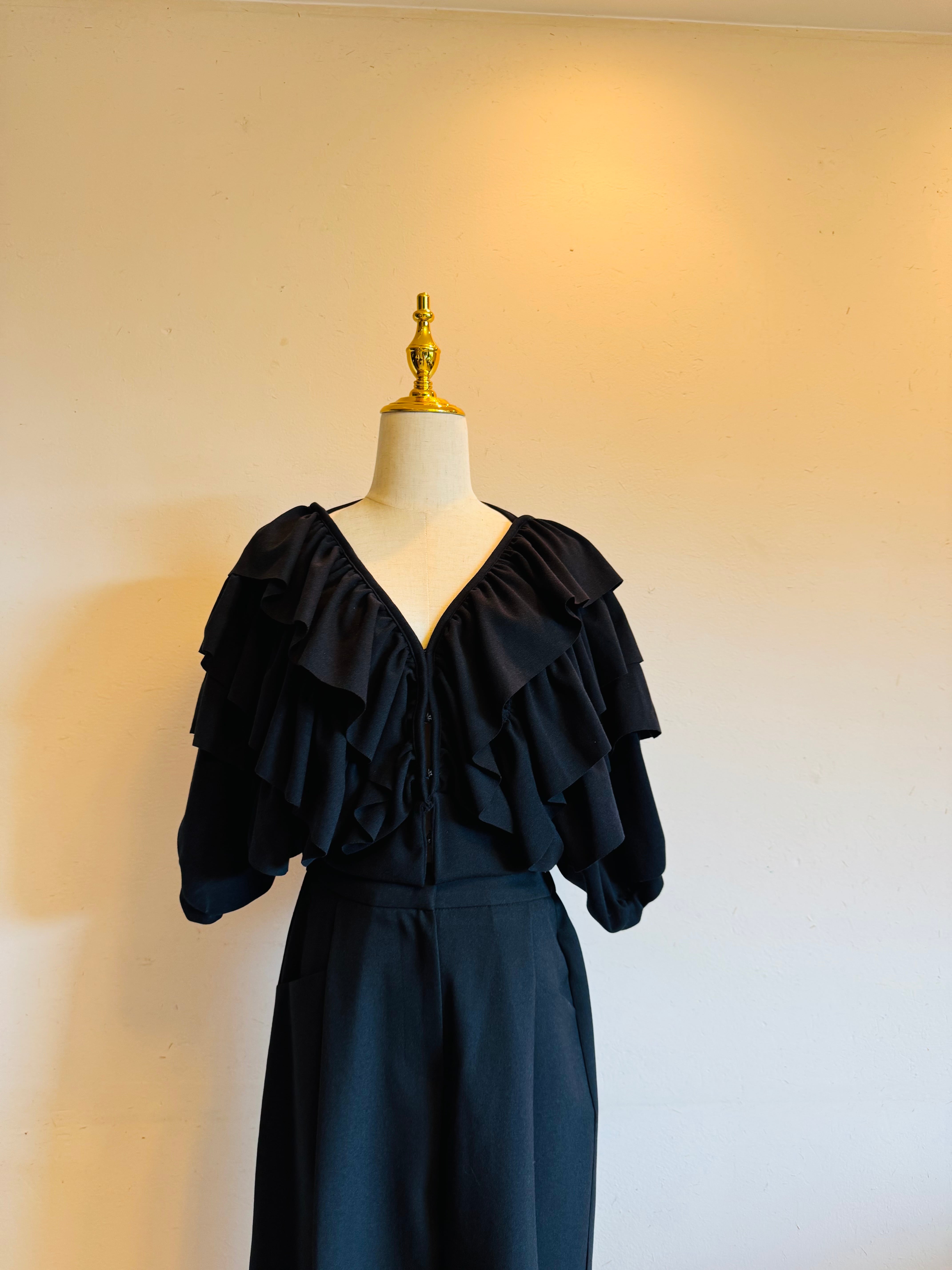 ドラマチックな印象を与えるブラックのラッフルレイヤードブラウスです。