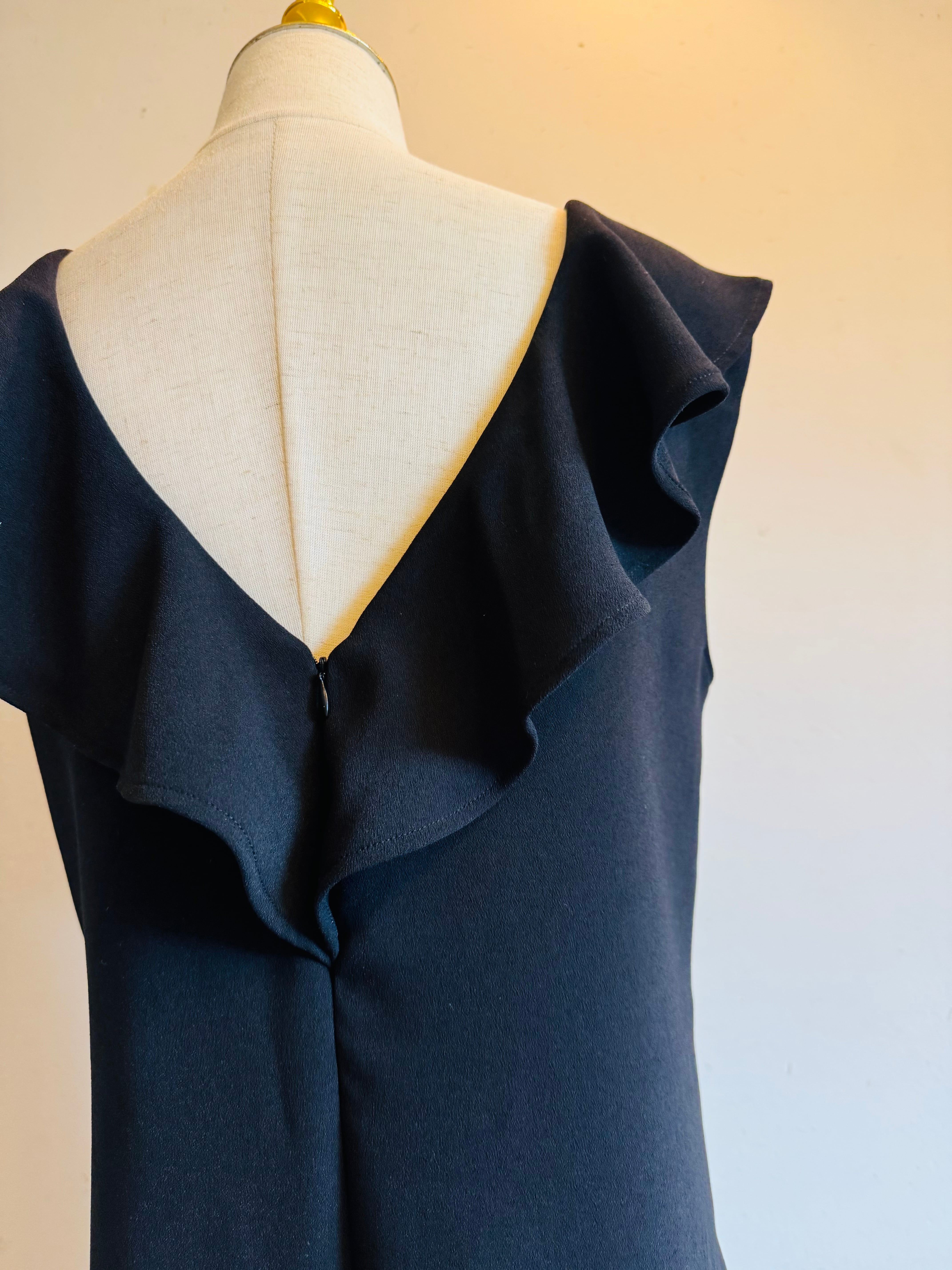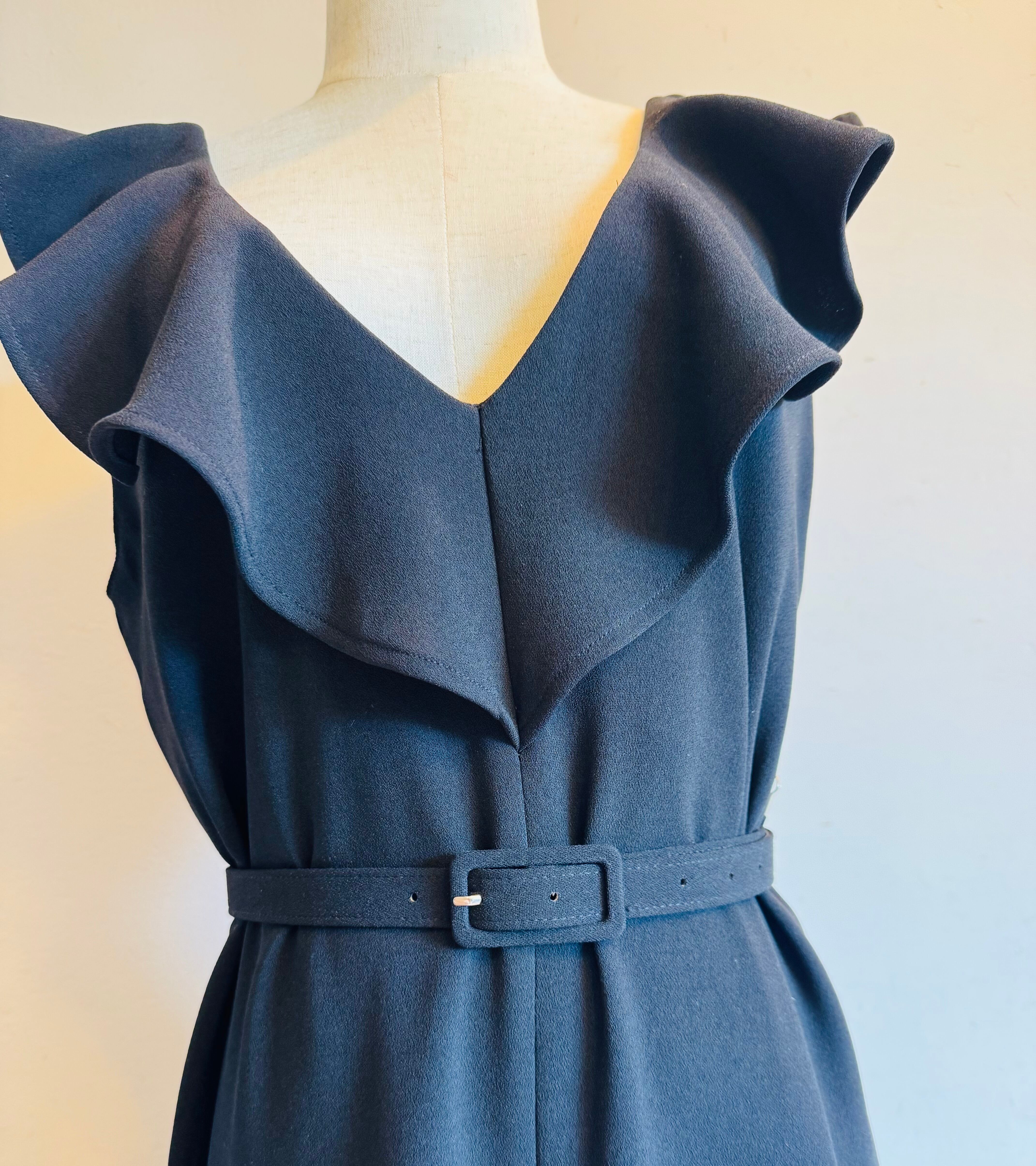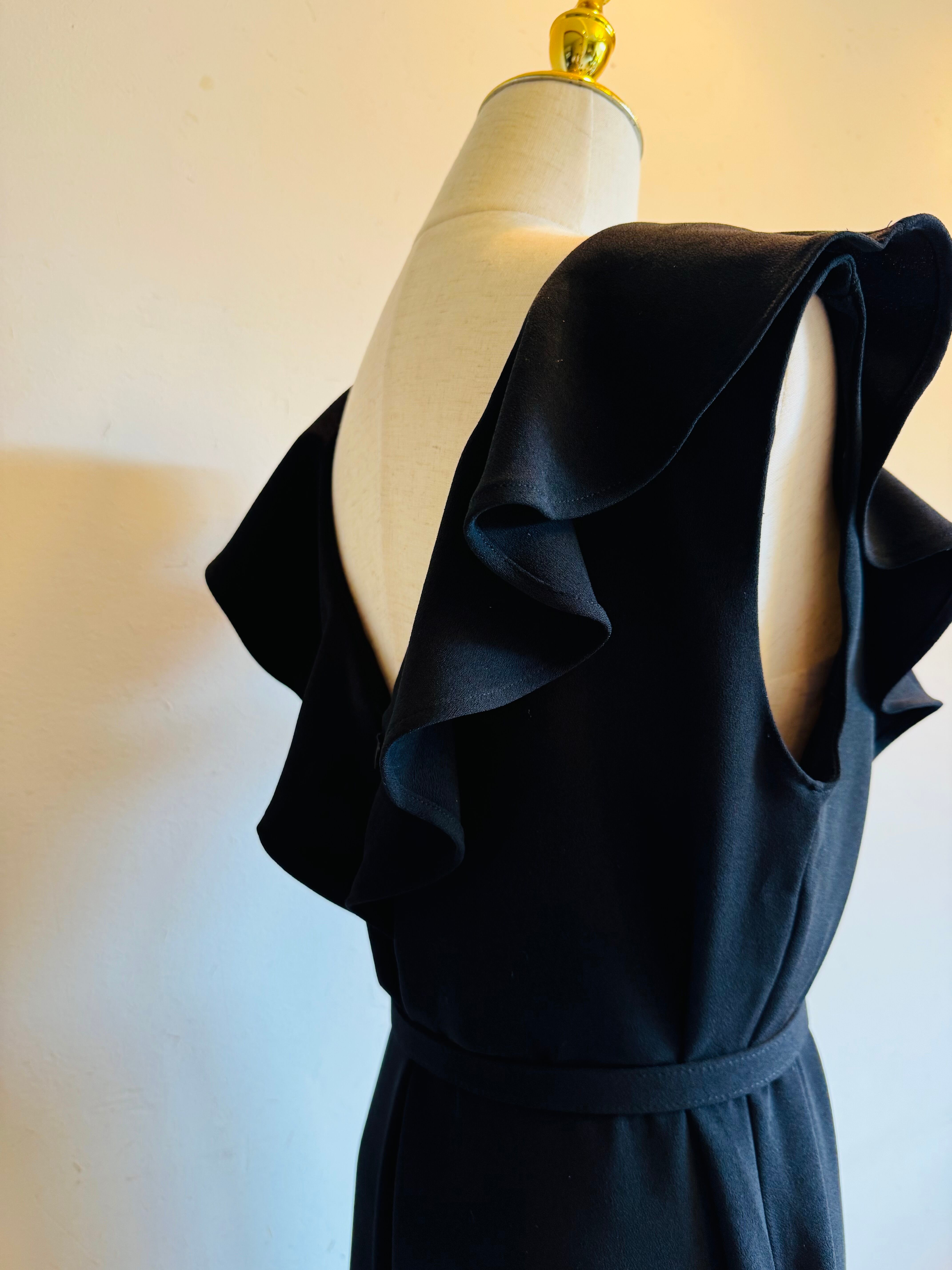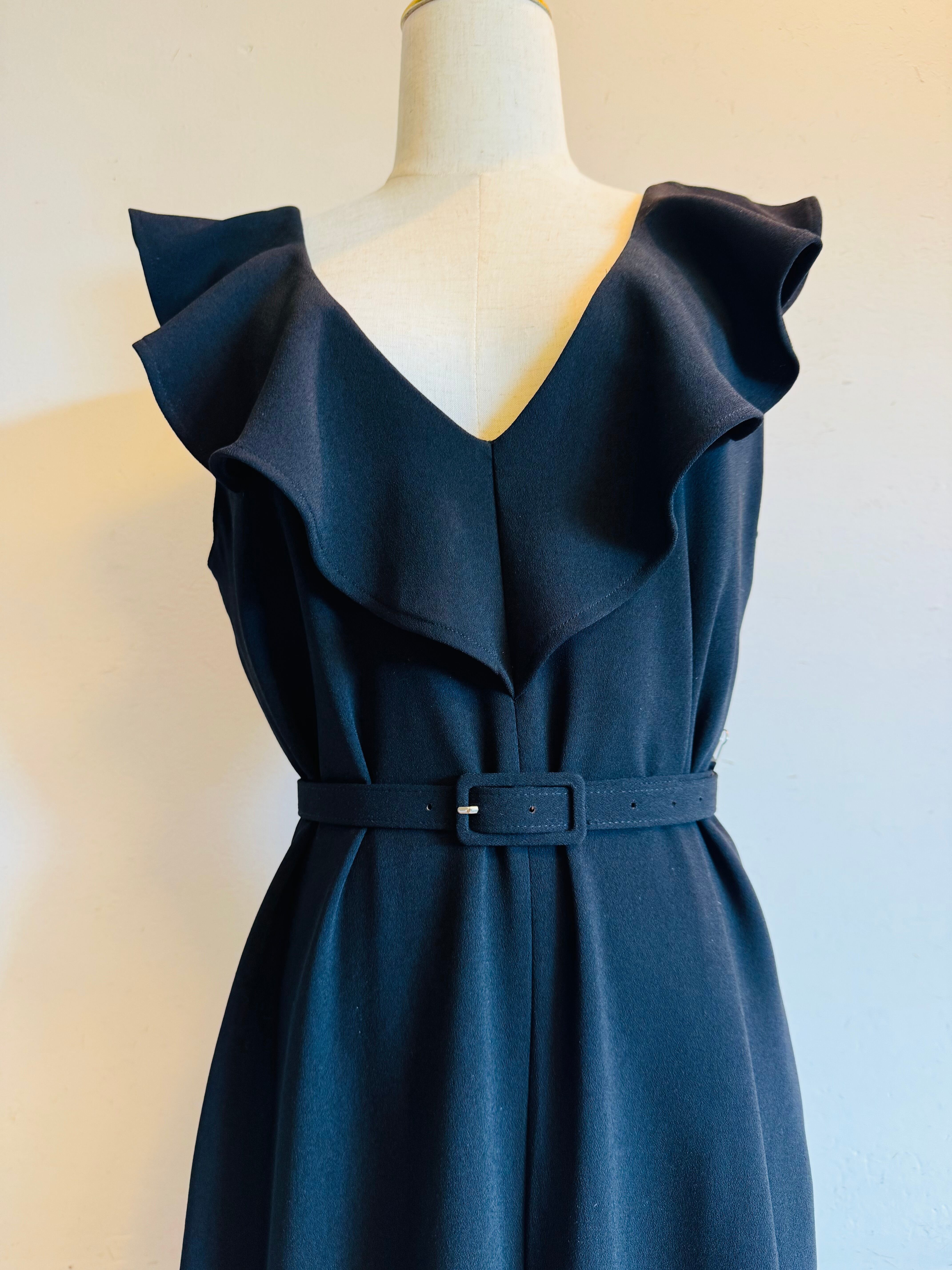 前後ともに深めのVラインとフリルが女性らしさを引き立て、顔まわりを華やかに演出します。付属の同素材ベルトでウエストをすっきりとマークすることで、脚長効果とスタイルアップを実現。ワイドなシルエットのパンツ部分は、動くたびに落ち感のある上品なラインを描き、安定感とモード感を両立します。
