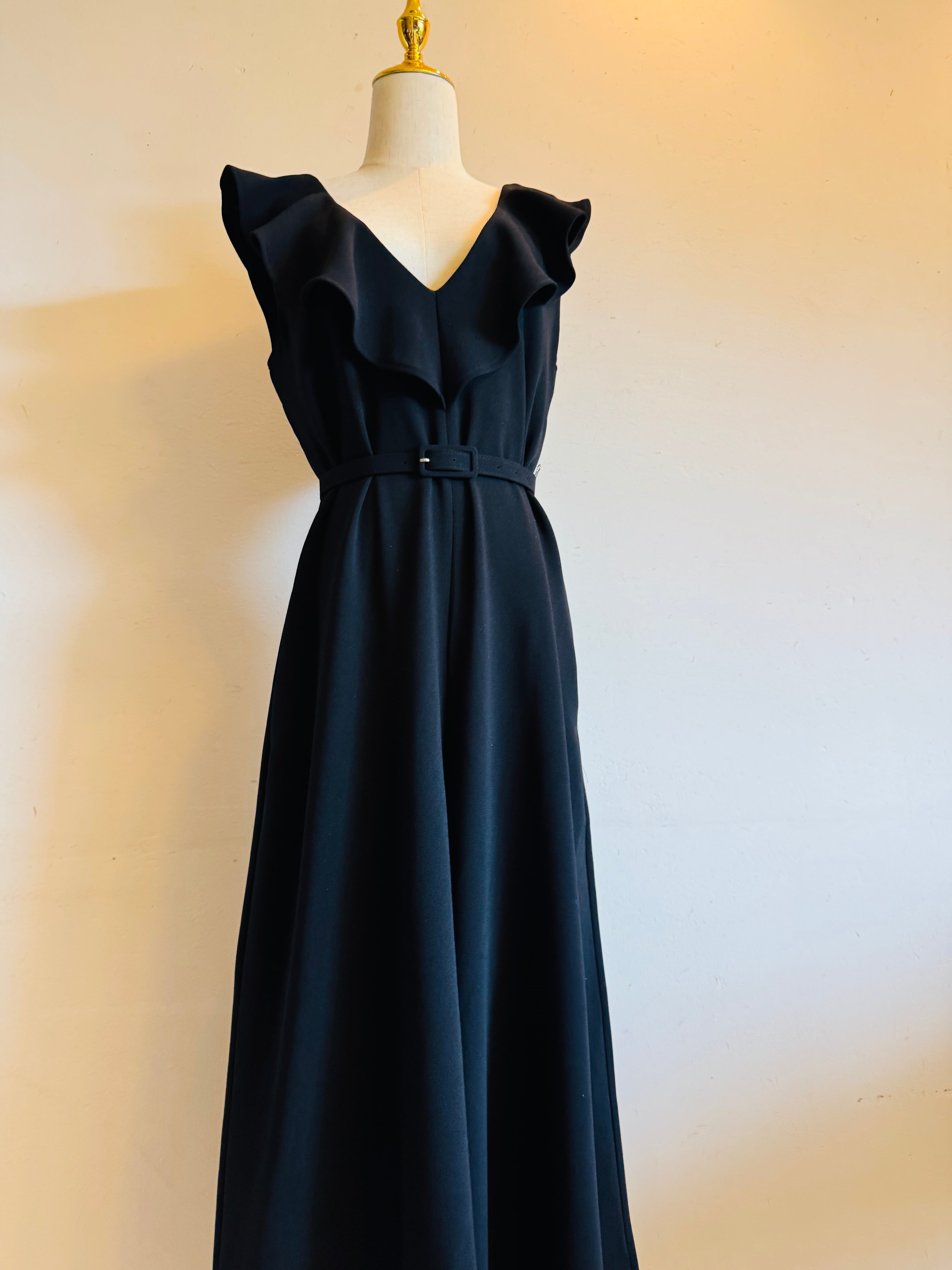 上品なフリルをあしらったVネックのワイドジャンプスーツ。