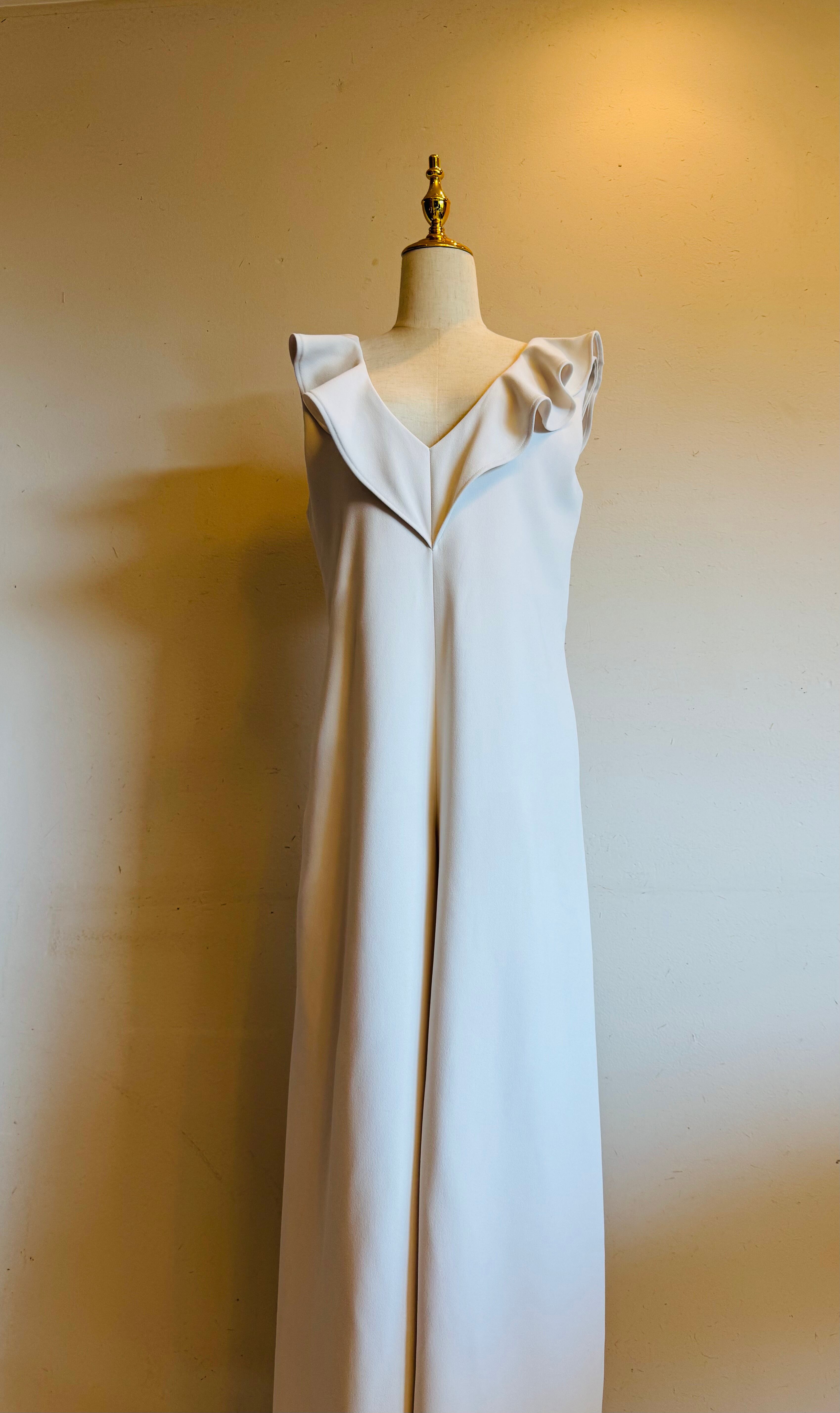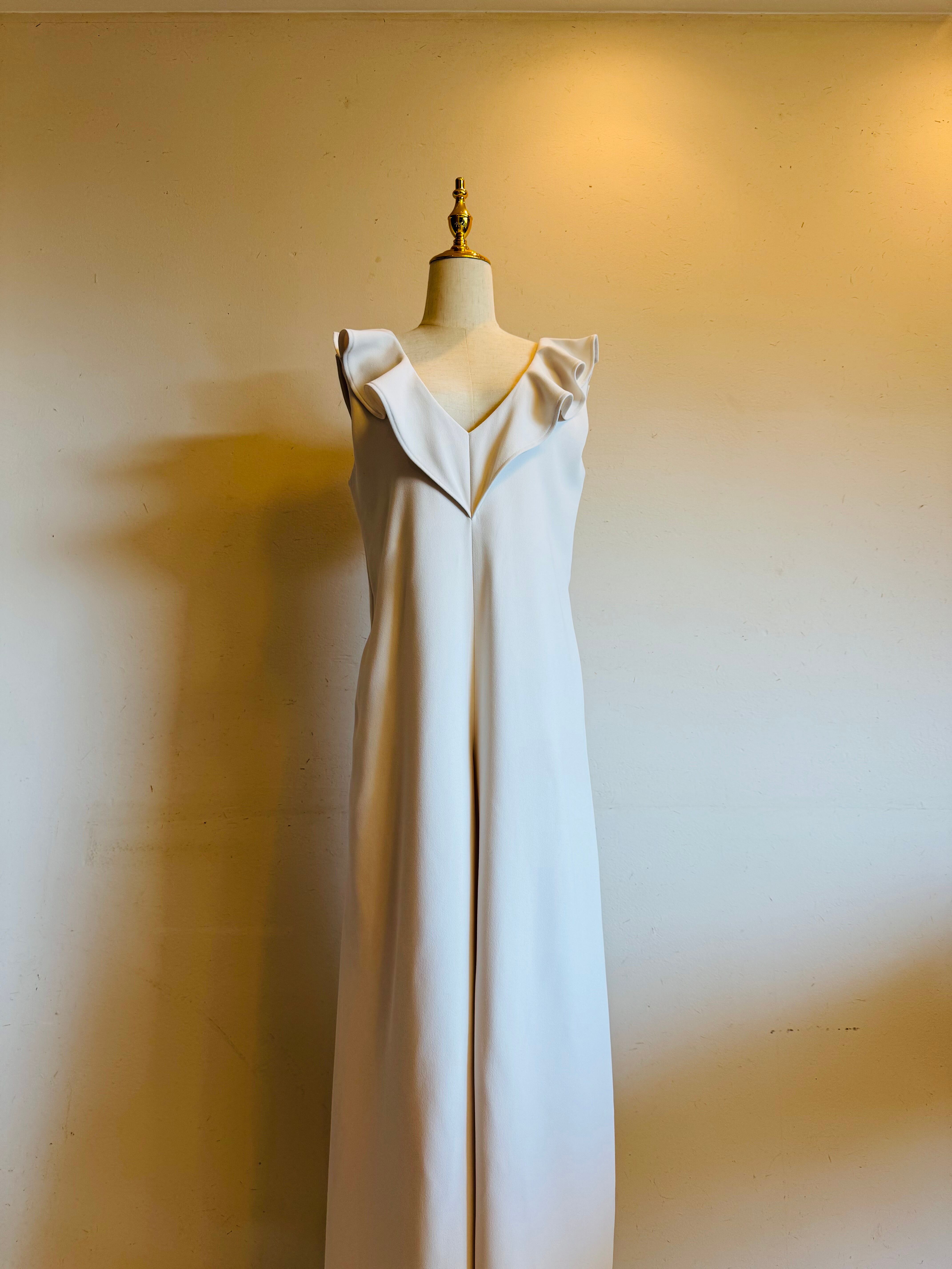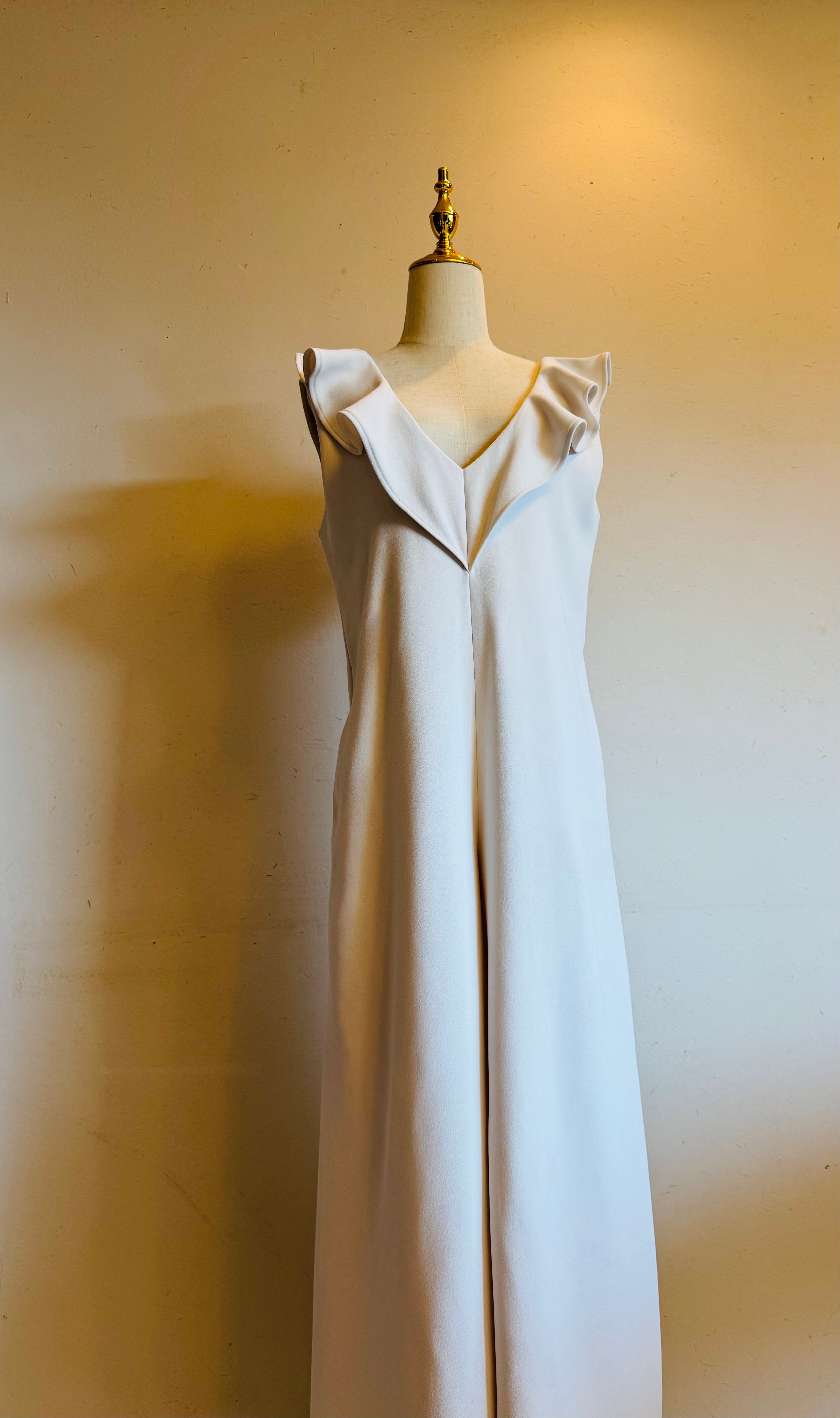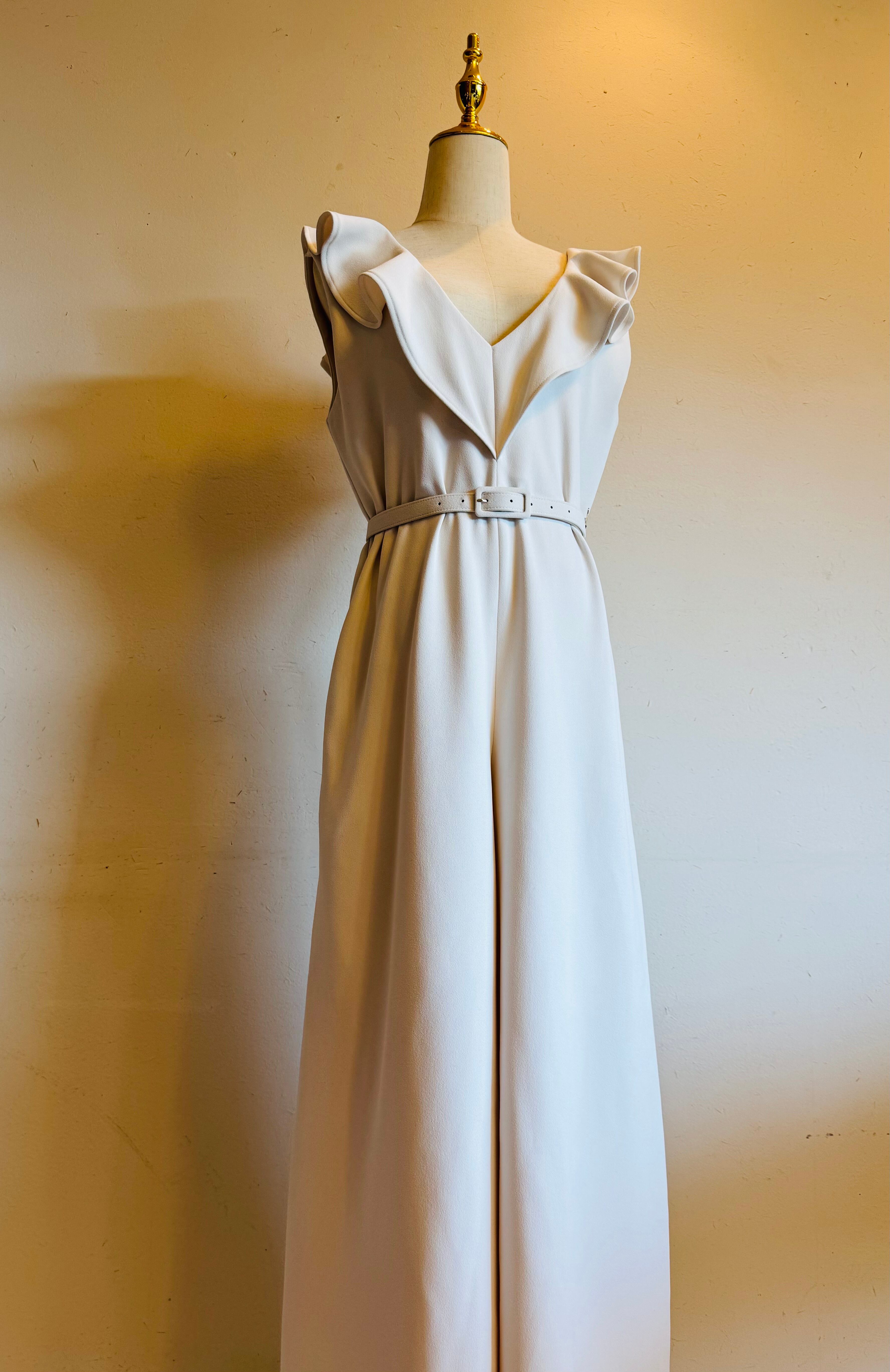 上品なフリルをあしらったVネックのワイドジャンプスーツ。