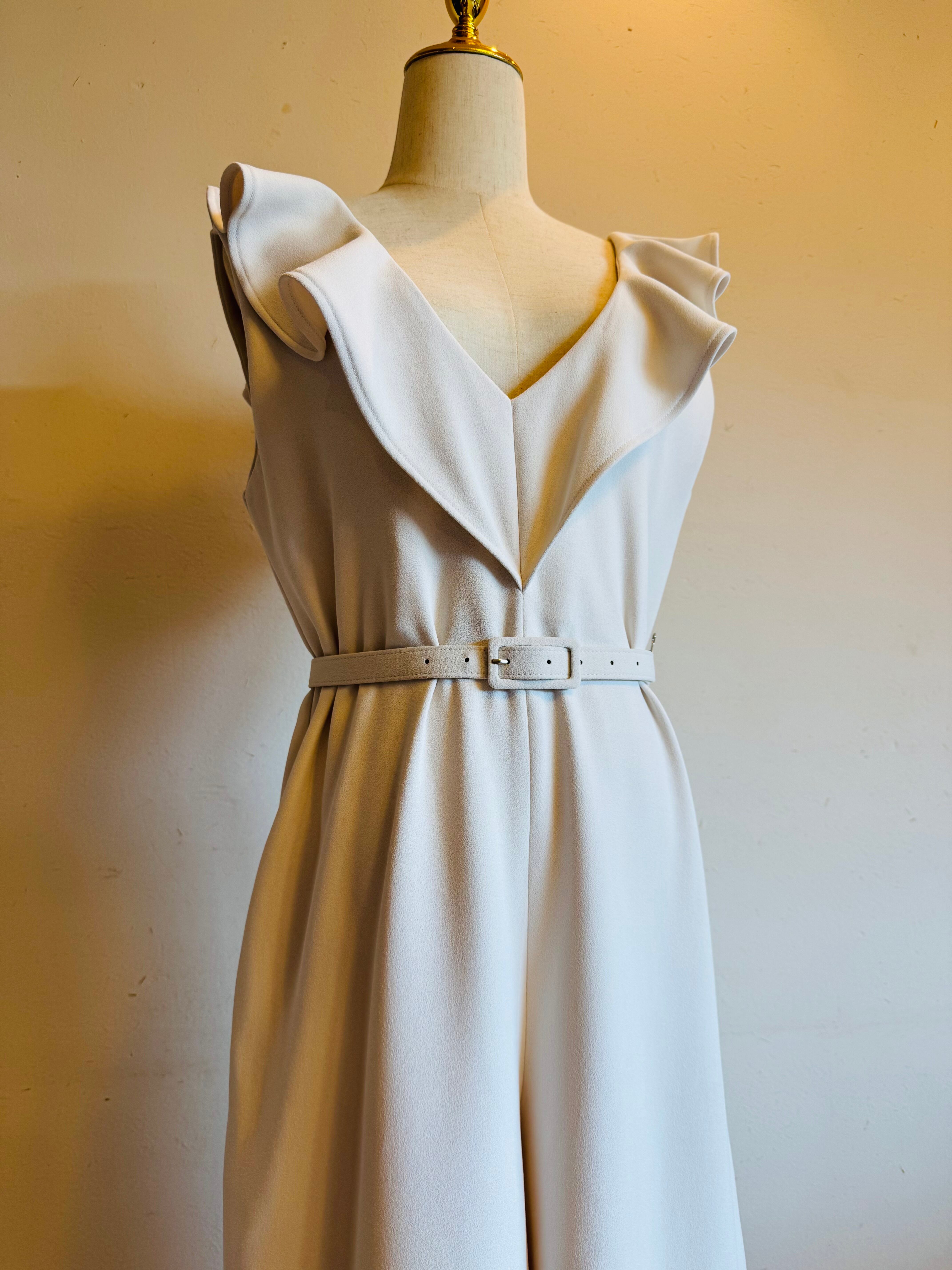 フリルVネック ベルト付きワイドジャンプスーツ