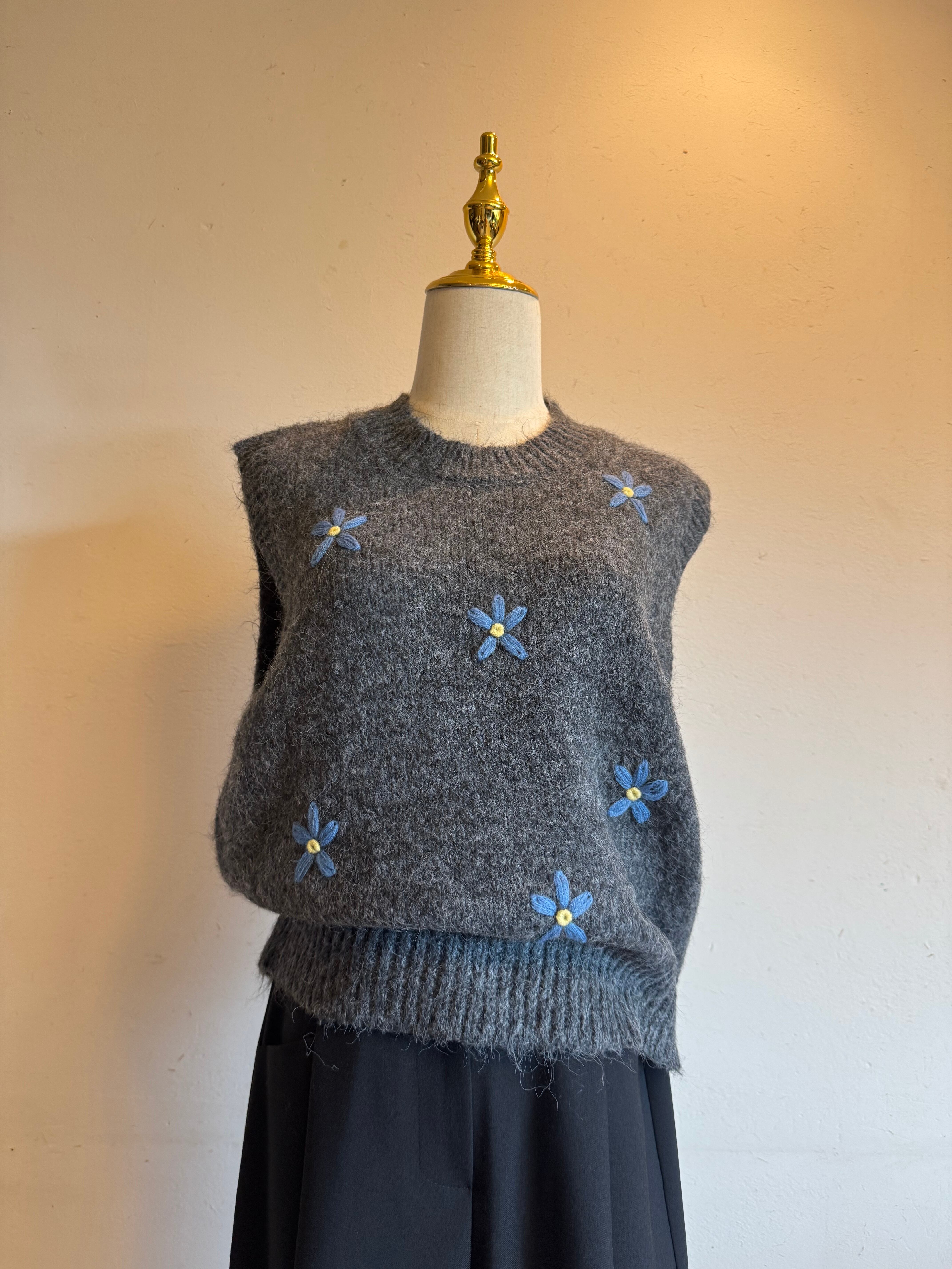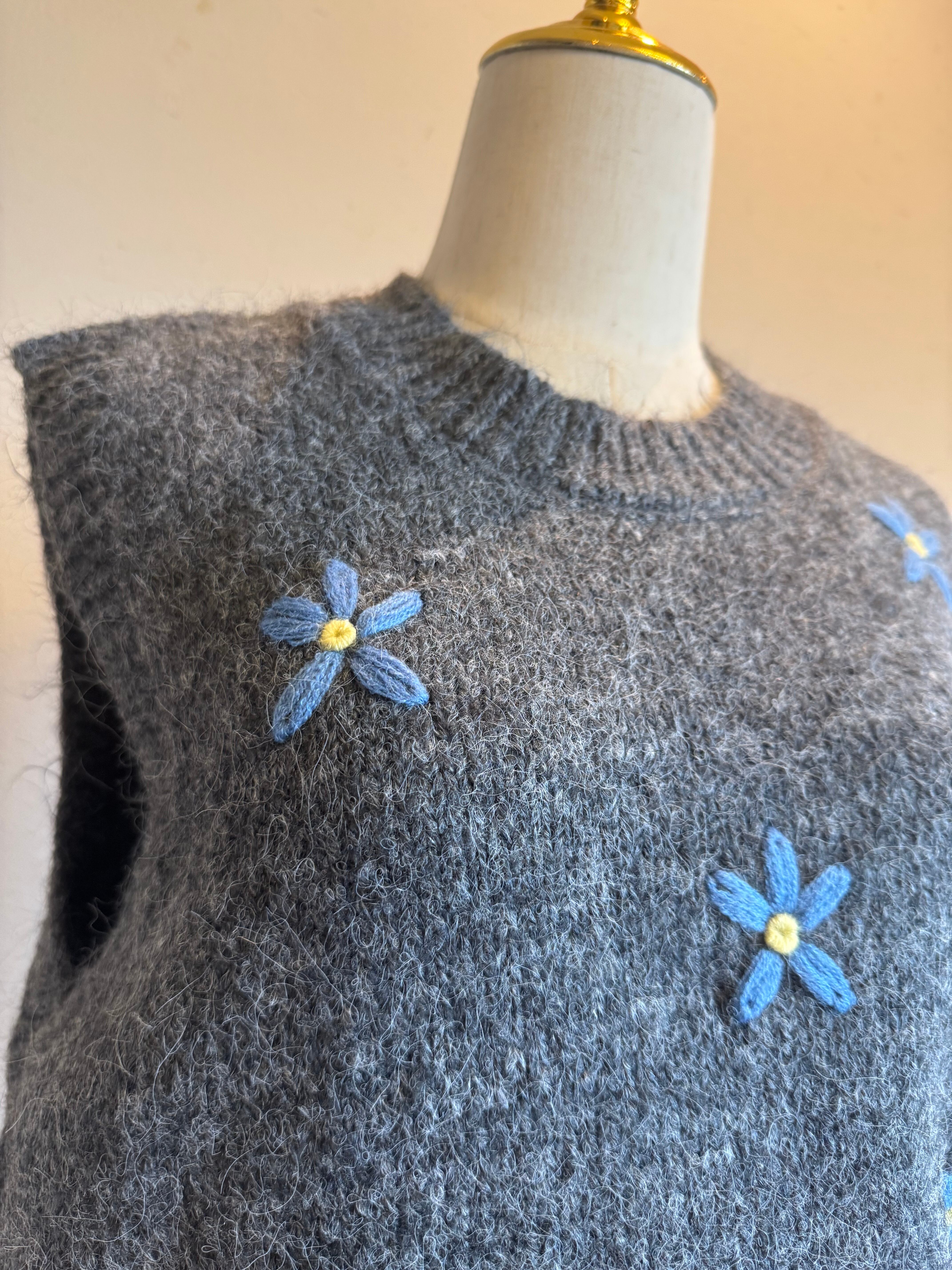 ふんわりとした毛足のある糸で編み立てられたニットベスト。
