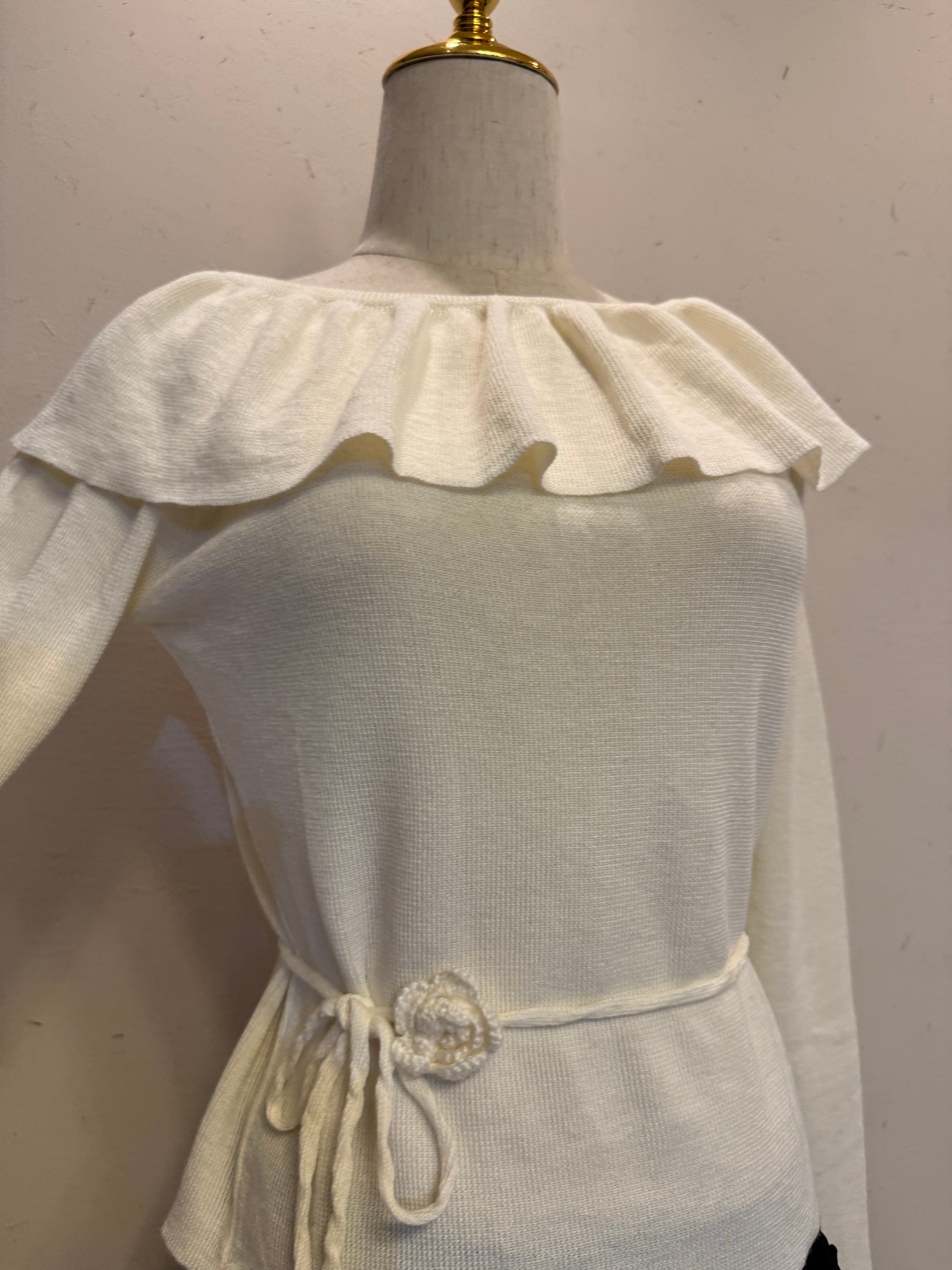広いフリルディテールが引き立つエレガントなニット上着で、首の部分と肩のラインを強調。